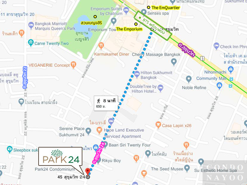 เรามีภาพการเดินทางมาให้ชมกัน เส้นทางการเดินทางตามลูกศรแดง โดยเริ่มเดินทางจาก แยกอโศก →วิ่งตรงตามถนนสุขุมวิท→ วิ่ง BTS พร้อมพงษ์ → เลี้ยวซ้ายเข้าซอยสุขุมวิท 24 → ตรงมาประมาณ 650 ม. ก็จะเจอพื้นที่โครงการ Park 24 แล้วค่ะ