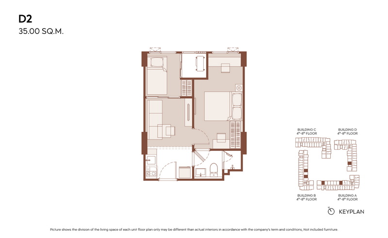 แปลนห้องตัวอย่างห้องที่ 2 เป็นห้องแบบ 1 Bedroom Plus ขนาด 35.00 ตร.ม. ห้องนี้ถูกออกแบบมาได้น่าสนใจ มีการจัดวาง Layout ในแต่ละส่วนออกมาให้อยู่ 2 คนได้สบายมากขึ้น ภายในถูกแยกฟังก์ชันไว้ 4 ส่วนหลัก ๆ