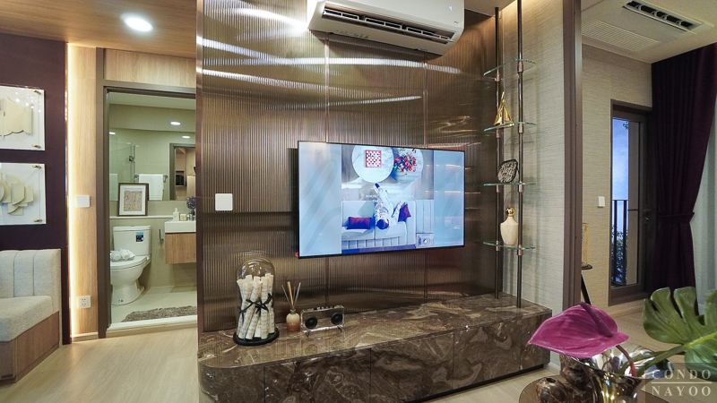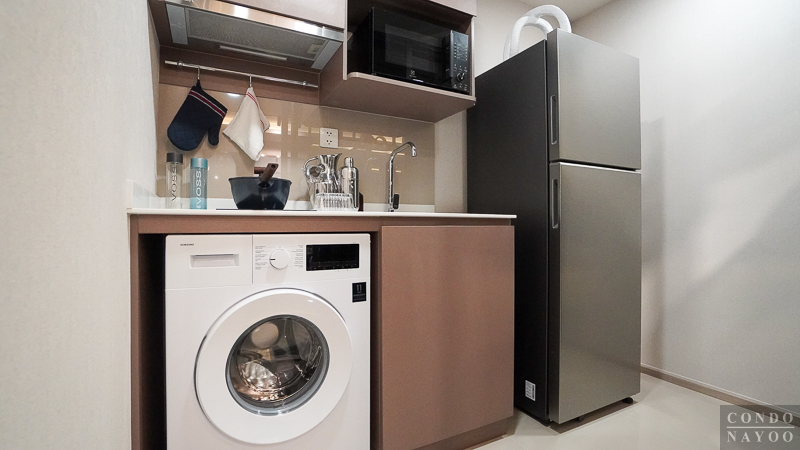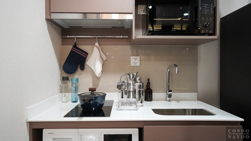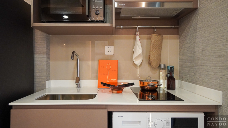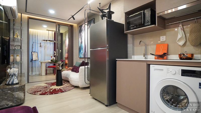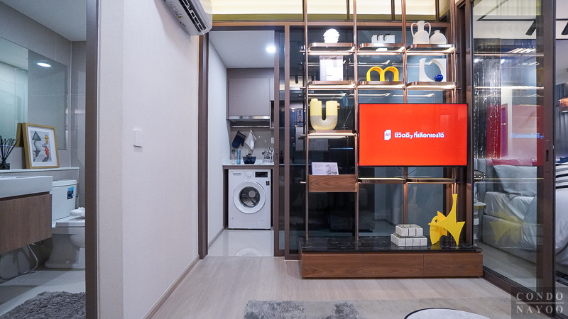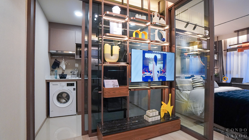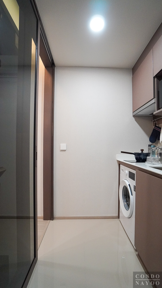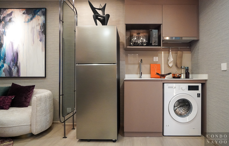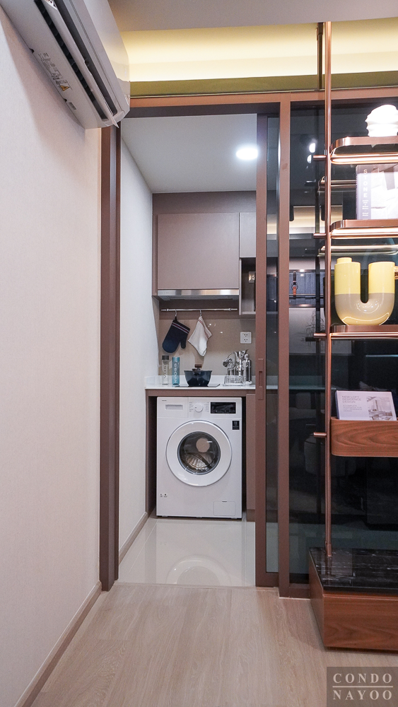 ด้านหลังชั้นวางทีวีจะเป็นห้องครัวปิด ที่มีการกั้นประตูกระจกบานเลื่อนมาให้แล้ว สามารถทำอาหารหนัก ๆ ได้ โดยที่ไม่ต้องกลัวว่ากลิ่นหรือคัวนจะออกไปรบกวนด้านนอก