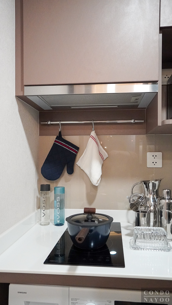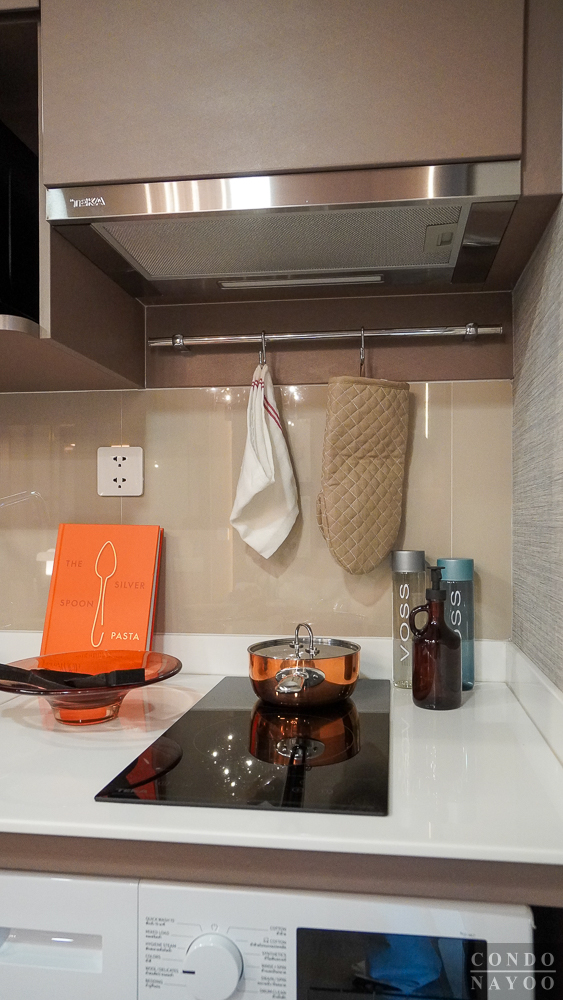 อีกฝั่งจะติดตั้งเตาไฟฟ้า 2 หัว ปุ่มควบคุมแบบสัมผัส พร้อมเครื่องดูดควัน Slimline ของ Teka ระบบหมุนเวียน ผนังด้านหลังมีราวแขวนผ้า และหมุดแขวนของใช้ติดมาให้ตามนี้