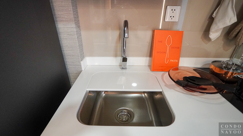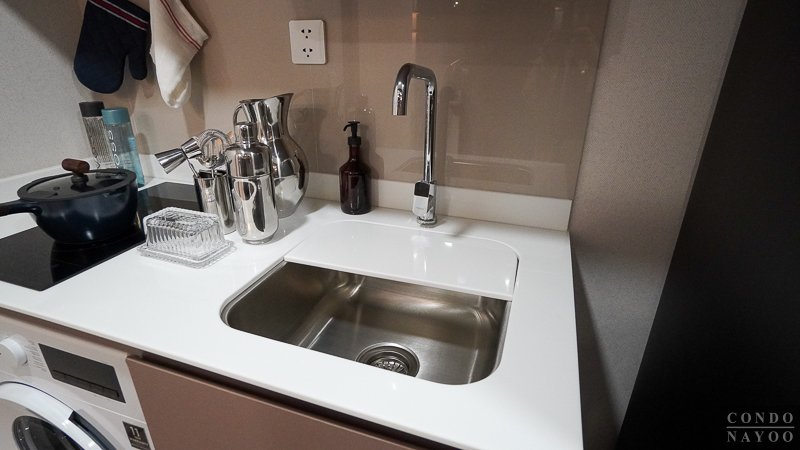 ได้ซิงค์ล้างจานสแตนเลสหลุมเดี่ยว ก๊อกน้ำทรงสูงแบบก้านโยก ทำให้ล้างจาน ล้างของได้ง่าย โดยหน้าซิงค์จะมีบานหินสังเคราะห์ปิดมาให้ด้วย ช่วยเพิ่มพื้นที่หน้าครัวให้เตรียมอาหาร วางของต่าง ๆ ได้เยอะมากขึ้นค่ะ