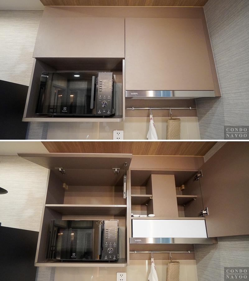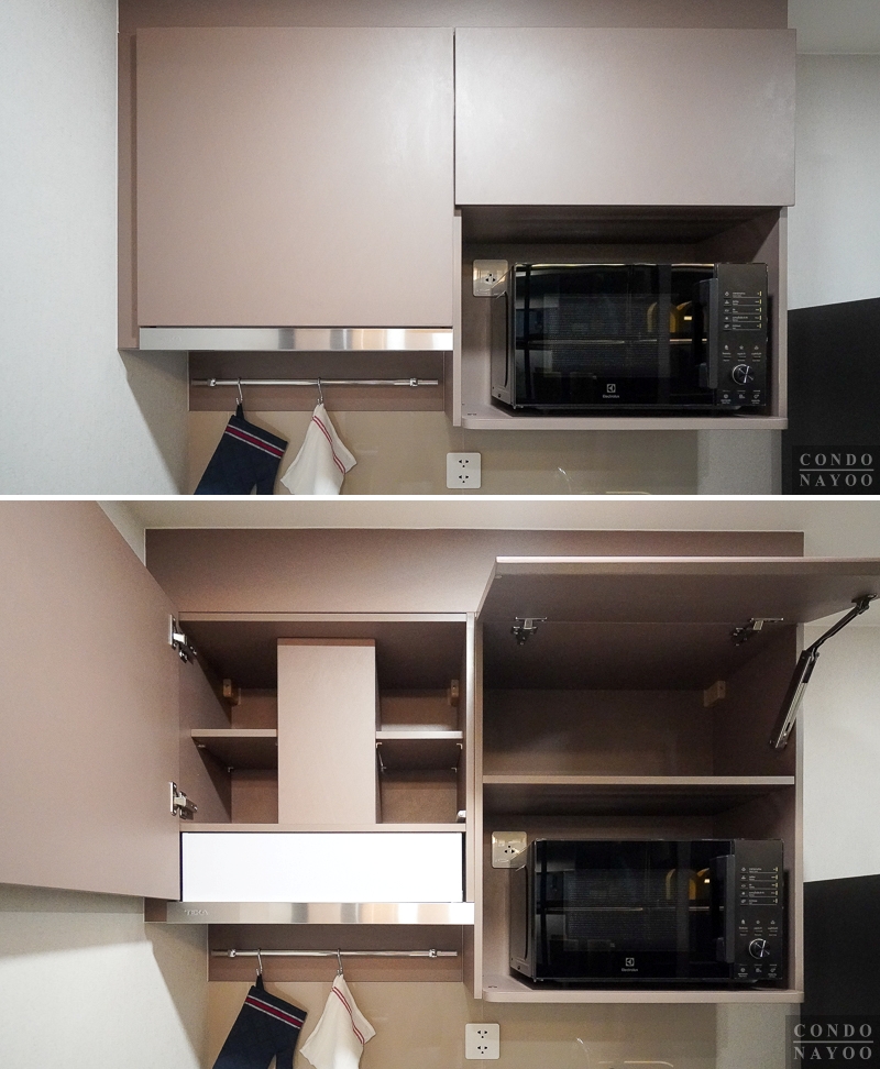 ด้านบนจะได้ตู้เก็บของบานเปิดลายไม้ เปิดออกมาจะมีชั้นลอยให้ 2 ชั้น ทำให้เก็บของชิ้นเล็ก ชิ้นน้อย หรือใช้เป็นตู้เก็บถ้วยกาแฟ อาหารแห้งก็ดี อีกฝั่งจะเป็นชั้นวางไมโครเวฟ และชั้นวางพวกขวดเครื่องปรุงได้ที่ด้านบนค่ะ