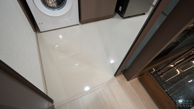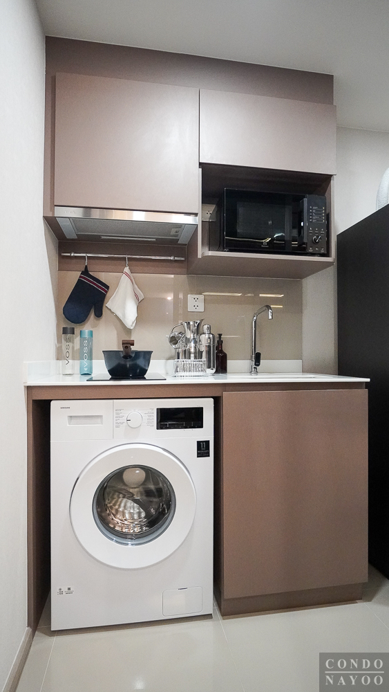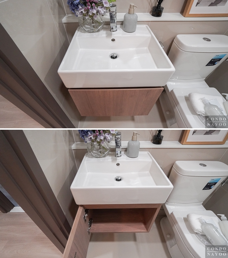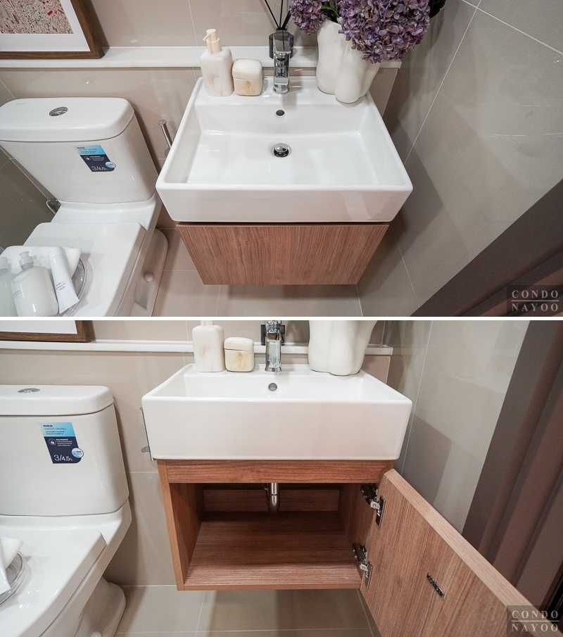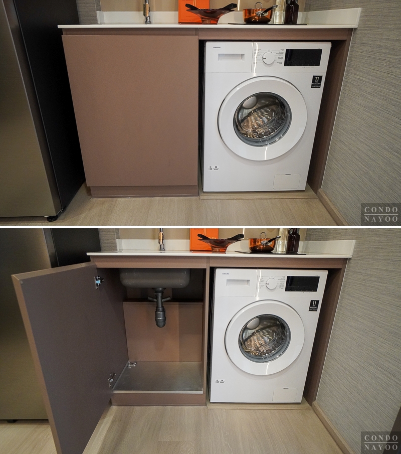 ด้านล่างได้ฟังก์ชันมาครบเหมือนห้องก่อนหน้า คือ มีตู้เก็บของใต้ซิงค์ขนาดใหญ่ และมีช่องสำหรับวางเครื่องซักผ้าฝาหน้าที่มีการเดินงานระบบน้ำ-ไฟไว้ด้านหลังให้พร้อมต่อใช้งาน