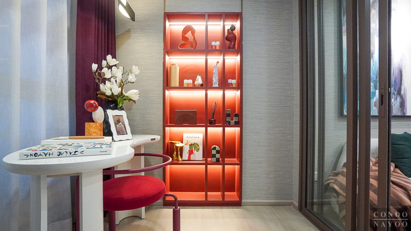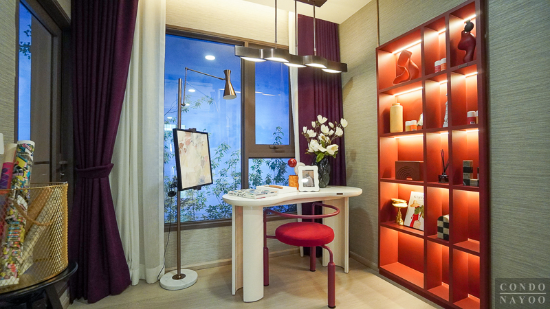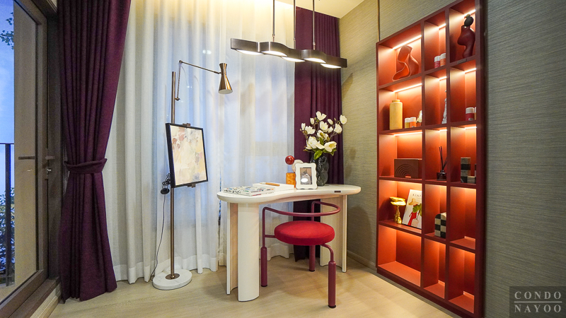 ห้องตัวอย่างตกแต่งเป็น Hobby Room จัดวางชั้นเก็บของ มุมวาดภาพ และโต๊ะทำงานชิดหน้าต่าง ให้ใช้งานได้จริงและได้แสงธรรมชาติเต็มที่