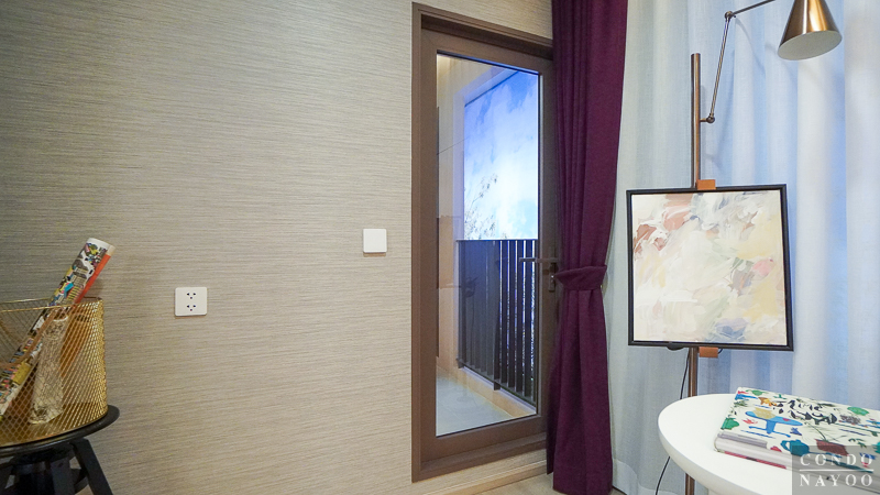 จากในห้องนอนจะมีประตูกระจกบานเลื่อนให้ใช้เปิดเชื่อมกับระเบียงพักผ่อนได้