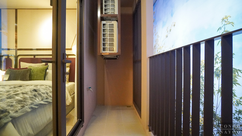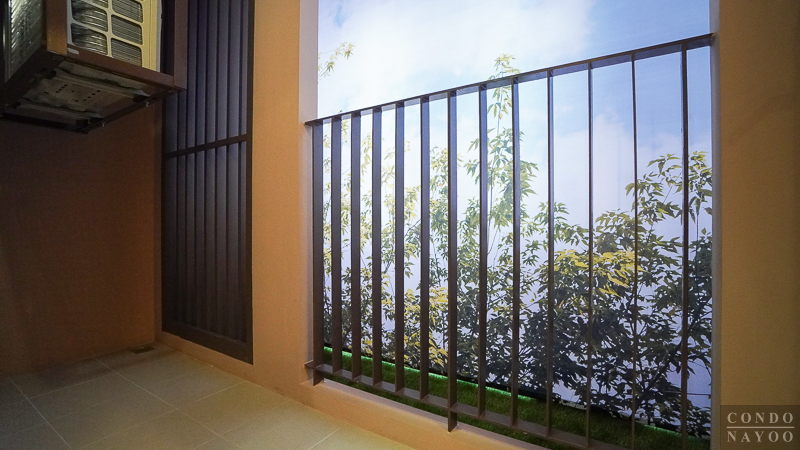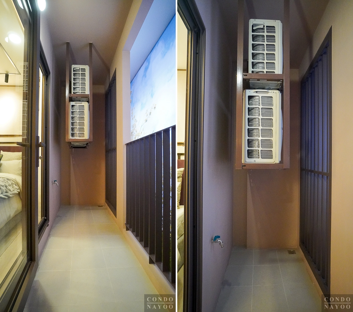 ระเบียงจะมีการปูพื้นกระเบื้องเซรามิกกันลื่นให้เรียบร้อย พร้อมติดราวกันตก และก๊อกสนามให้ 1 จุด ส่วนพื้นที่ใช้งานจะสามารถวางราวตากผ้า จัดสวนเล็ก ๆ หรือวางเก้าอี้ไว้ออกมานั่งเล่นรับชมได้ด้วย