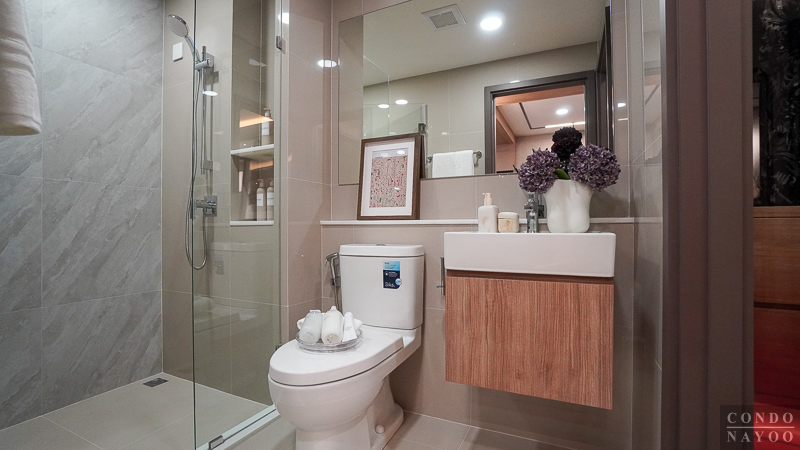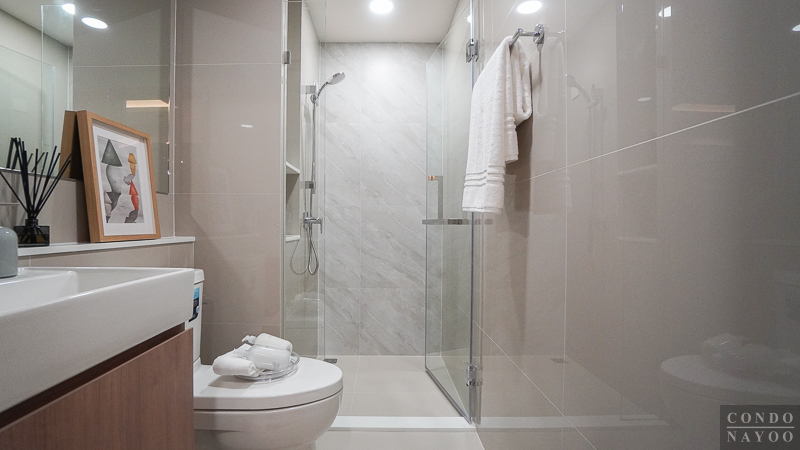 ภายในตกแต่งกระเบื้องพื้นและผนังในโทนสีอ่อนและลายหินอ่อน มีการแบ่งส่วนแห้ง กั้นแยกส่วนเปียกให้เรียบร้อย พร้อมติดตั้งสุขภัณฑ์มาตรฐานของแบรนด์ Kohler และมีพัดลมระบายอากาศติดมาให้ 1 ตัว ค่ะ