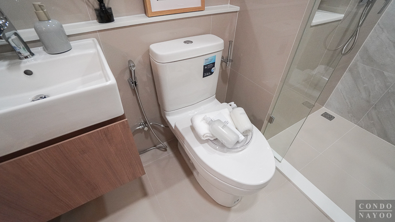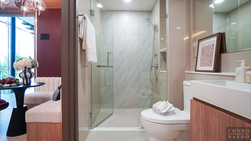 ภายในติดฝักบัว Hand Shower พร้อมราวปรับระดับ มีที่วางสบู่ และก๊อกน้ำโครเมียมก้านโยก ผนังมีชั้นวางของให้ 2 ชั้น พร้อม Junction Box รองรับการติดเครื่องทำน้ำอุ่นได้ทันที