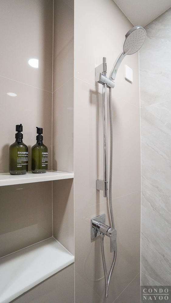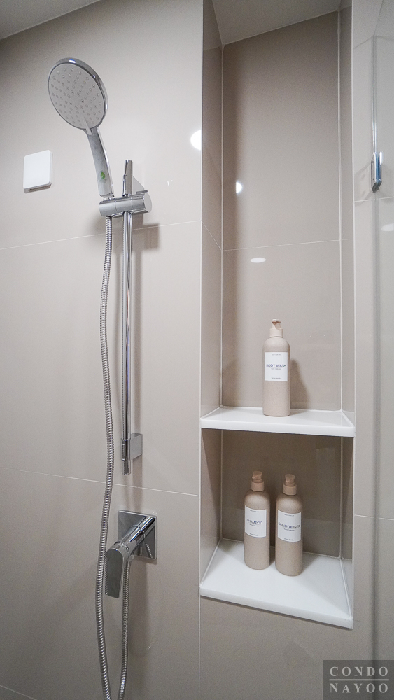 ภายในติดฝักบัว Hand Shower พร้อมราวปรับระดับสูง-ต่ำ, ถาดวางสบู่ และได้ก๊อกน้ำแบบก้านโยก เปิด-ปิดใช้งานได้ง่าย ส่วนผนังข้าง ๆ กัน จะมีการเจาะช่องทำชั้นวางของให้อีก 2 ชั้น และมีการเดินงานระบบไฟฟ้า ติด Junction Box มาให้พร้อมต่อเครื่องทำน้ำอุ่นได้เลยค่ะ