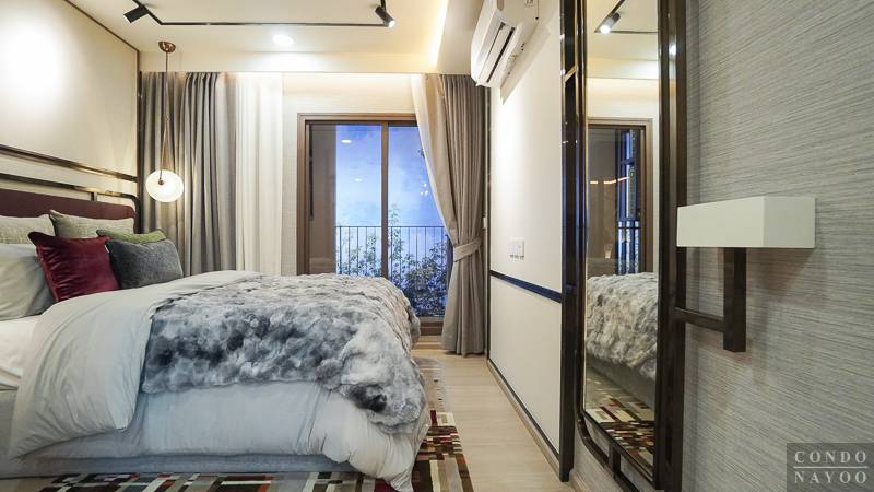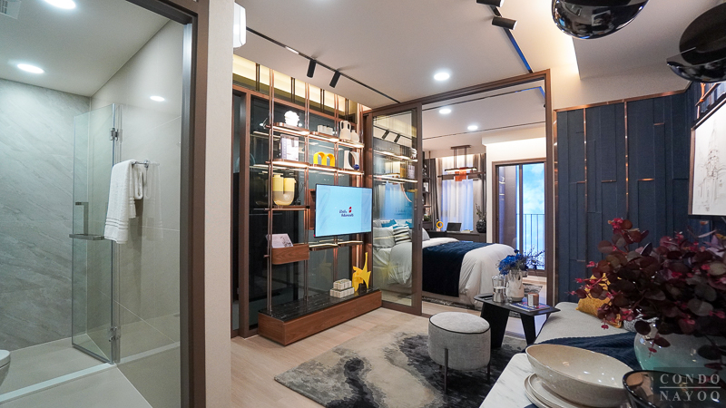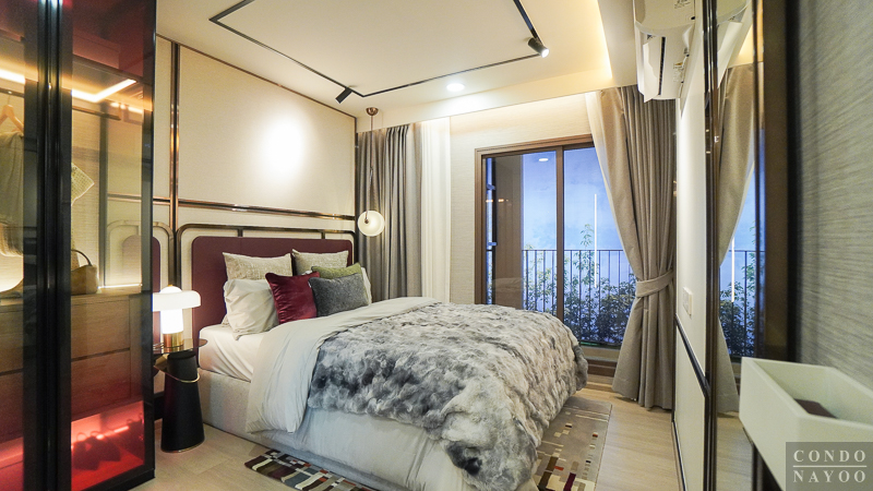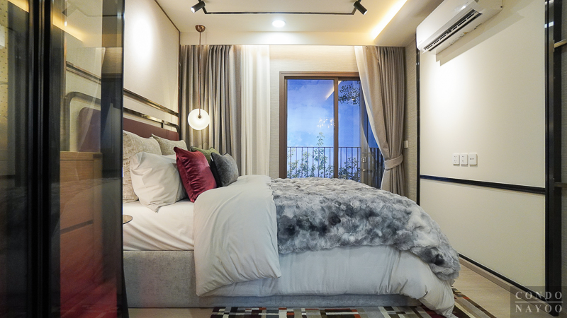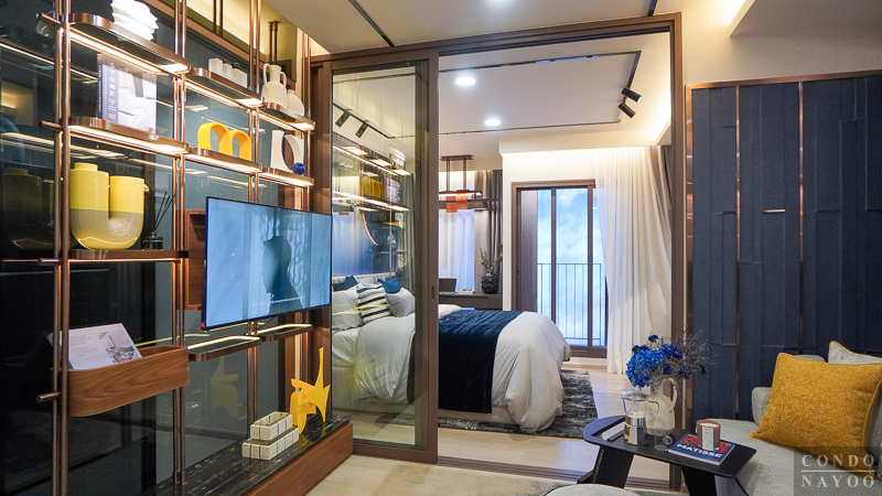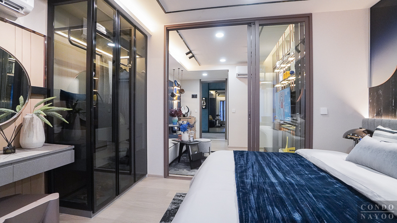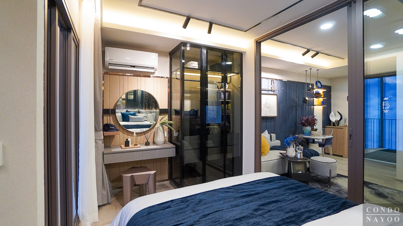 ถัดเข้าไปด้านในสุดเป็นห้องนอน จุดเด่นคือประตูกระจกบานเลื่อน 3 ตอนที่กั้นพื้นที่ออกจากส่วนอื่นอย่างชัดเจน ช่วยเพิ่มความเป็นสัดส่วนและความเป็นส่วนตัวมากขึ้น รูปแบบนี้เหมาะกับการอยู่ 2 คน เพราะขณะที่อีกคนพักผ่อน อีกคนยังใช้งานโซนด้านนอกอย่างห้องนั่งเล่นหรือมุมทำงานได้ โดยไม่รบกวนกัน