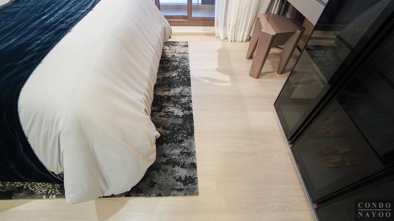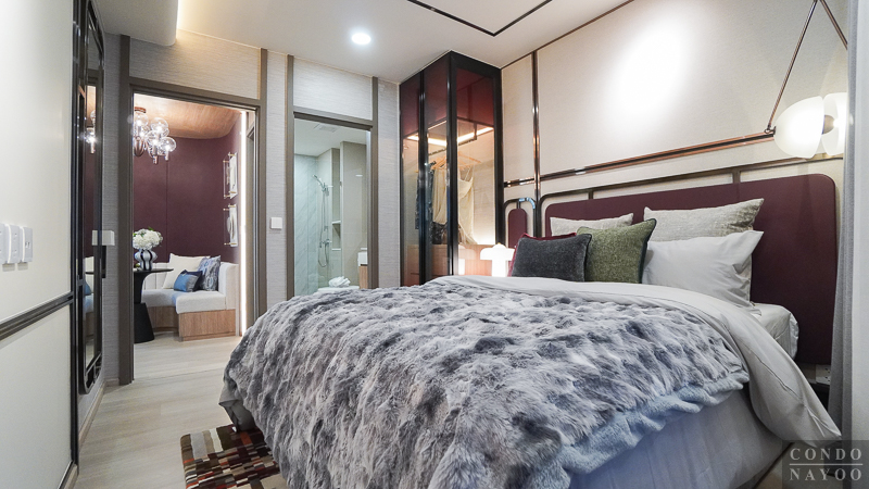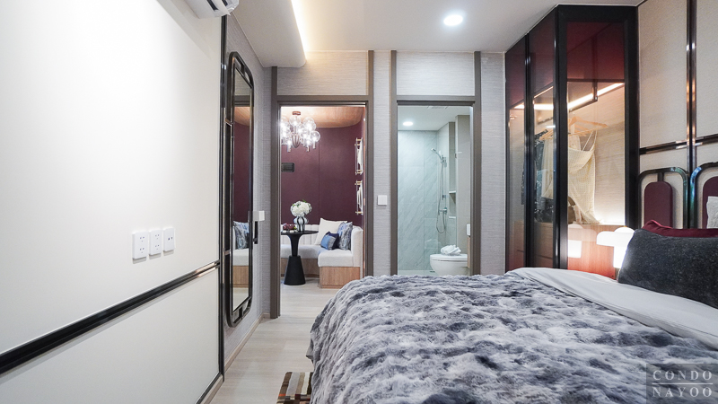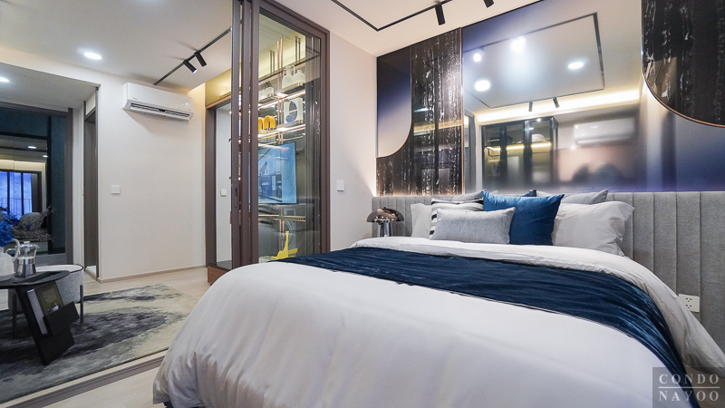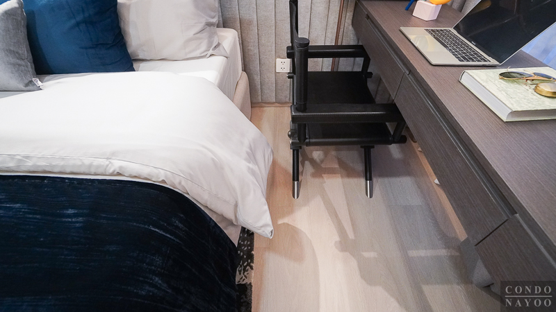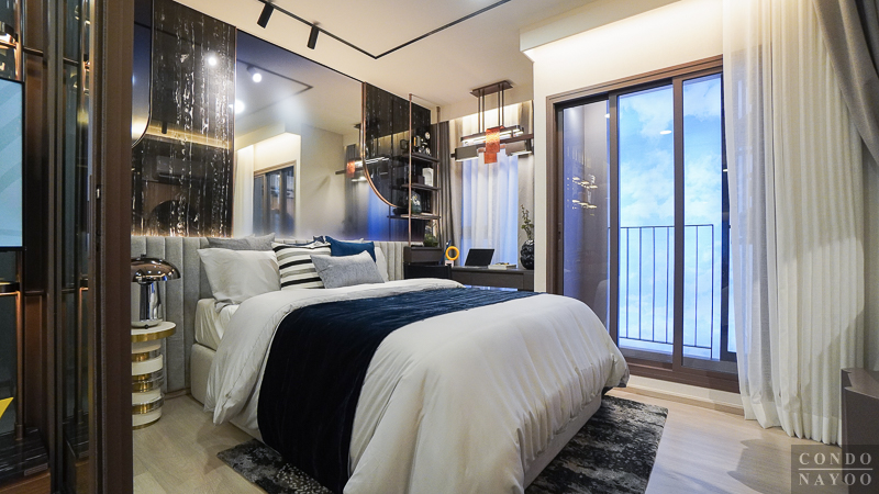 ในห้องตัวอย่างจะวางเตียง 5 ฟุต มาให้ดูเป็นไอเดีย พอวางเตียงเข้าไปแล้ว ก็ยังมีพื้นที่รอบ ๆ เตียงเหลือให้ใช้งานได้สะดวก และสามารถวางโต๊ะหัวเตียงเล็ก ๆ หรือโคมไฟตั้งพื้นเสริมเข้าไปได้