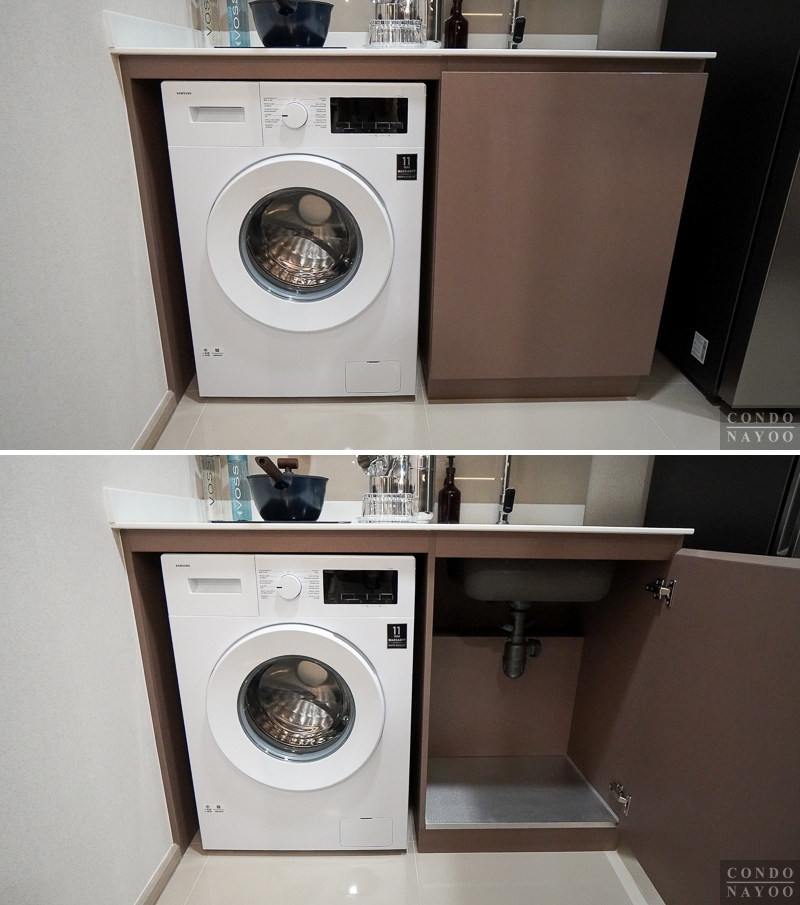 ด้านล่างจะได้ช่องวางเครื่องซักผ้าฝาหน้า ที่มีการเดินงานระบบน้ำ-ไฟให้ที่ด้านหลังแล้ว ติดกันเป็นตู้เก็บของใต้ซิงค์ขนาดใหญ่ ที่พื้นตู้จะติดแผ่นอะลูมิเนียมกันน้ำ กันชื้นมาให้