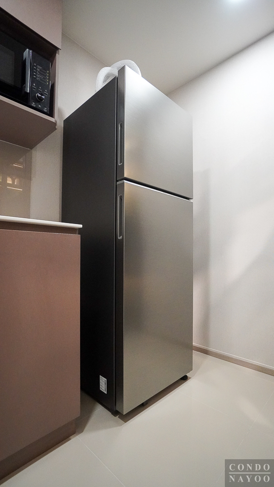 ถัดจากชุดครัวมาจะมีพื้นที่เหลือประมาณ 90 x 60 ซม. รองรับตู้เย็น 2 ประตู ขนาดตั้งแต่ 6-10 คิว ได้สบาย ๆ เลย ที่ผนังด้านหลังมีเต้าเสียบปลั๊กไฟติดมาให้พร้อมเสียบต่อใช้งานค่ะ