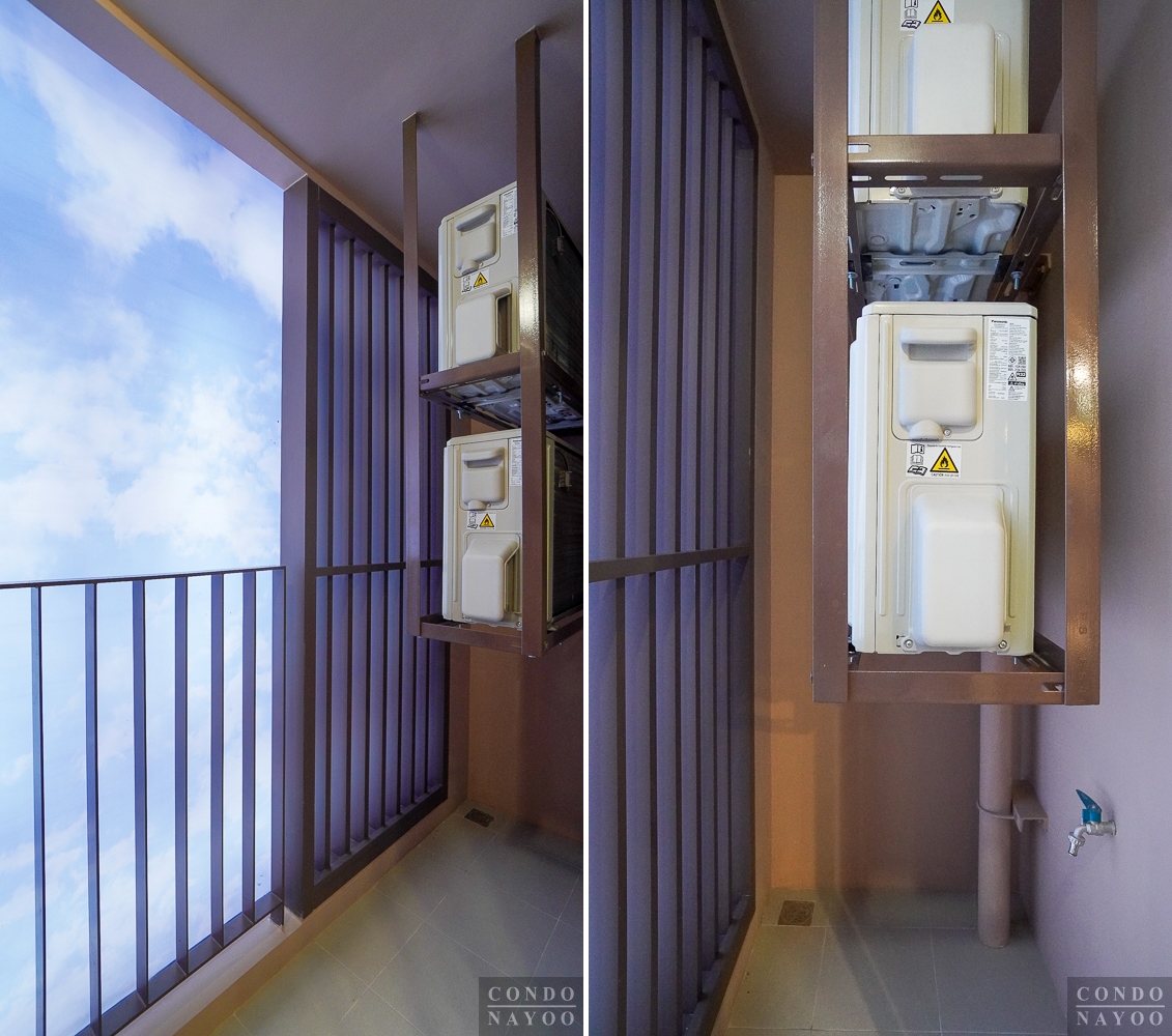 ตรงระเบียงจะติดราวกันตกและระแนงบัง CDU ไว้ให้แบบนี้ และที่ระเบียงก็จะมีก๊อกสนามและโคมไฟติดไว้ให้ครบแล้วค่ะ