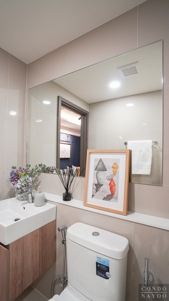 ผนังด้านหลังมี Low-Wall ให้วางของใช้ในห้องน้ำได้เยอะ อีกทั้งยังกระจกเงาบานใหญ่ ทำให้ห้องน้ำดูกว้างขึ้นด้วยค่ะ
