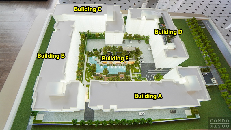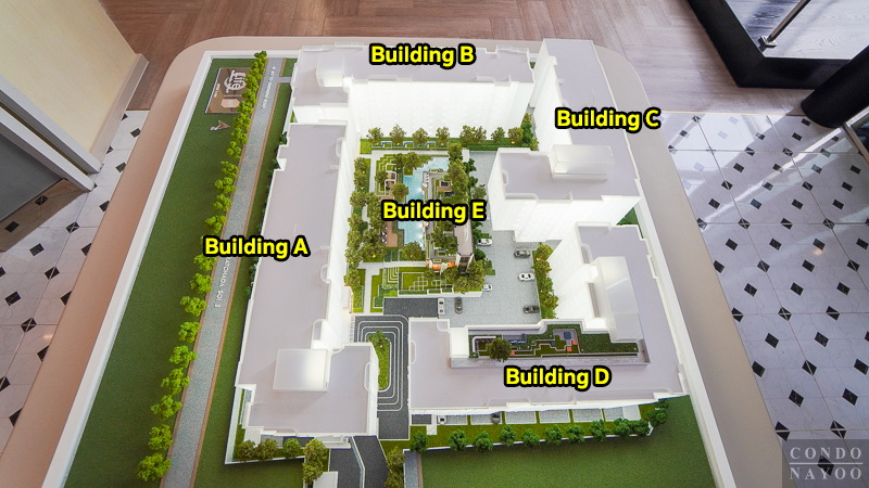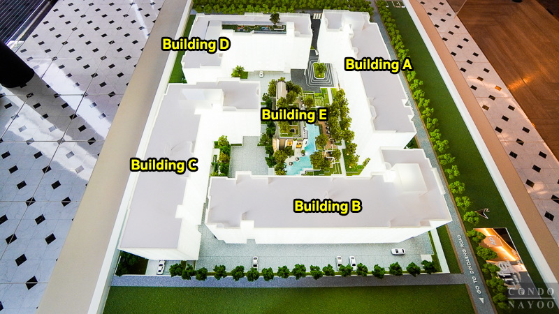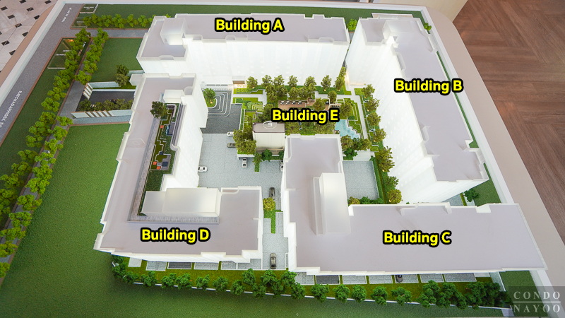 บนที่ดินกว่า 8 ไร่ พัฒนาเป็นอาคารพักอาศัยสูง 8 ชั้น จำนวน 4 อาคาร และอาคารส่วนกลางสูง 3 ชั้น แยกอีก 1 อาคาร วางไว้กลางคอร์ทเพื่อให้ลูกบ้านทุกอาคารเดินมาใช้พื้นที่ร่วมได้สะดวกเท่า ๆ กัน