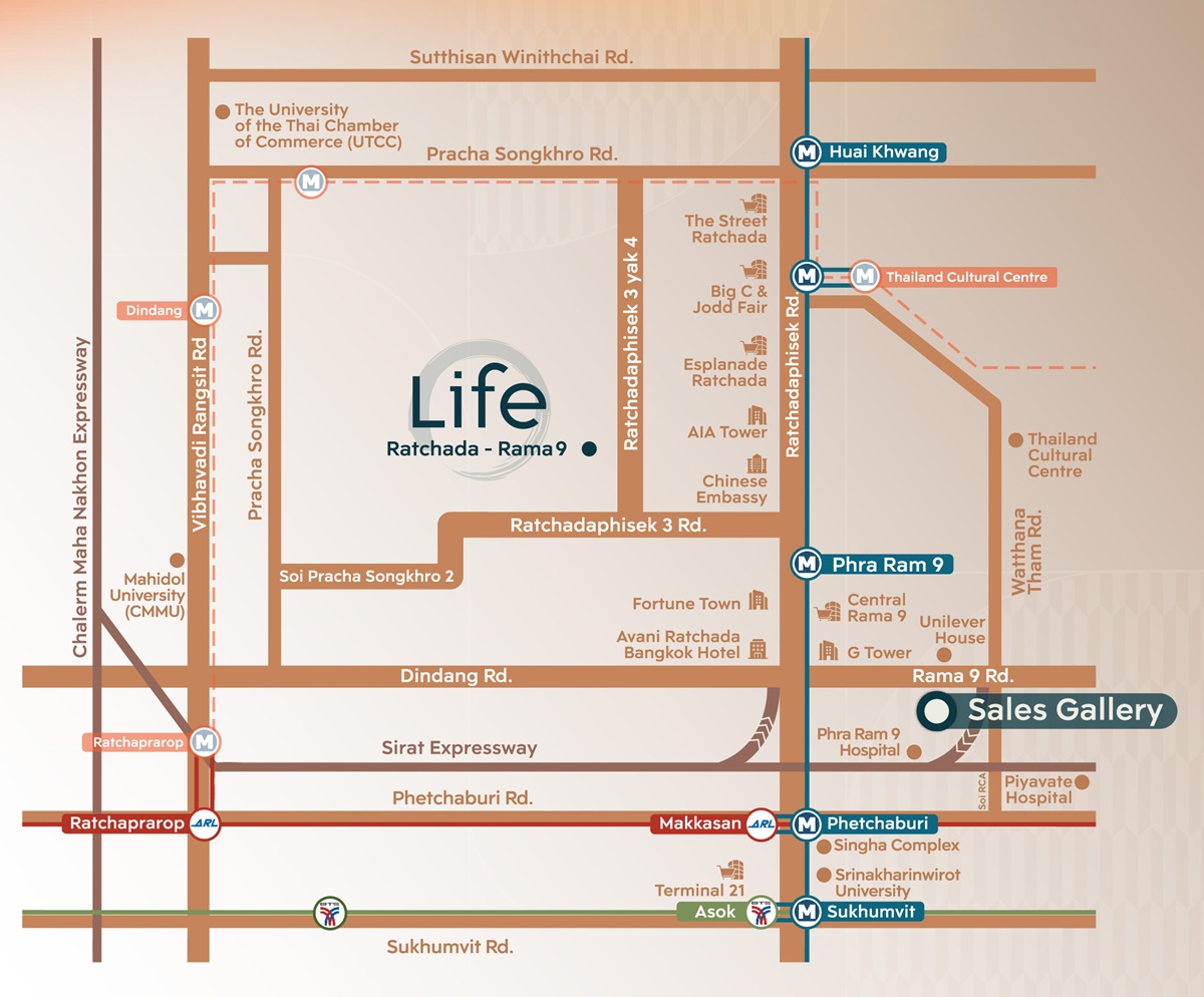 ⇒ ทำเลที่ตั้งโครงการ : Life รัชดา-พระราม 9 คอนโด Low-Rise จาก AP Thailand ภายใต้แบรนด์ Life ตั้งอยู่ในซอยรัชดาภิเษก 3 บนโซน New CBD พระราม 9 ย่านเมืองที่ใช้ชีวิตสะดวกโดยแทบไม่ต้องวางแผนล่วงหน้า