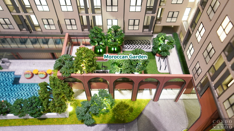 ⇒ การออกแบบโครงการ การออกแบบห้องพัก และวัสดุ : ตัวโครงการออกแบบเป็นคอนโด Low-Rise สูง 8 ชั้น 2 อาคาร สร้างเอกลักษณ์ด้วยแนวคิดการออกแบบสไตล์ Modern Moroccan ที่นำแรงบันดาลใจจากสถาปัตยกรรมโมร็อกโกมาผสานเข้ากับความเรียบหรูและทันสมัย ให้บรรยากาศที่แตกต่างจากคอนโดทั่วไป อีกทั้งยังออกแบบโครงสร้างให้ได้มาตรฐานต้านทานแรงแผ่นดินไหว เพื่อเพิ่มความมั่นใจให้กับผู้อยู่อาศัย
