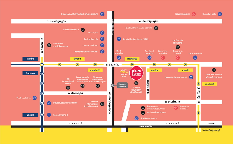 สถานที่สำคัญและสิ่งอำนวยความสะดวกโดยรอบโครงการ Plum Condo East ลาดพร้าว มีความอุดมสมบูรณ์สูงมาก ๆ ทั้งในระยะสั้น ๆ ที่เดินได้ และระยะที่ต้องขับรถออกไปใช้งาน
