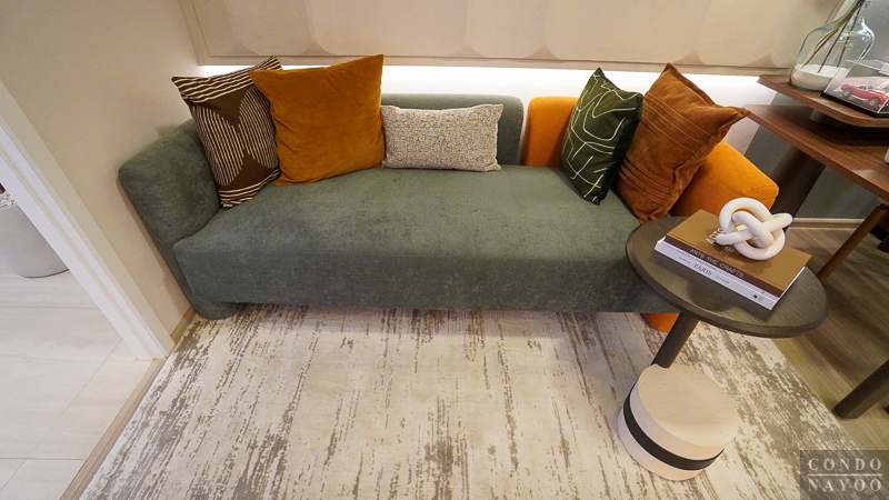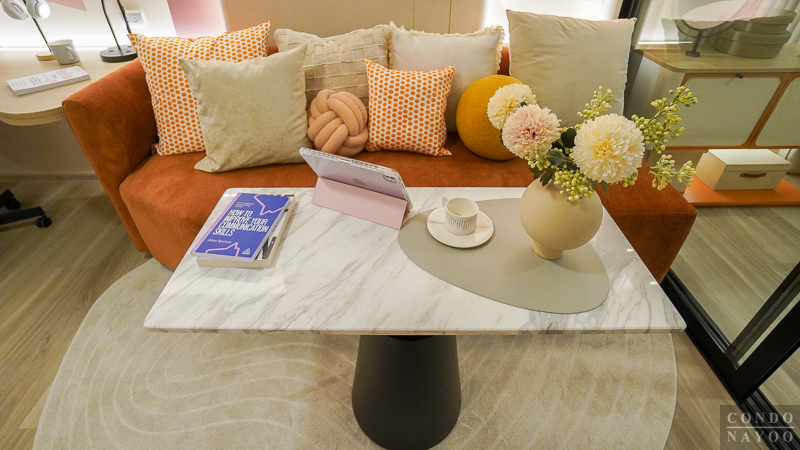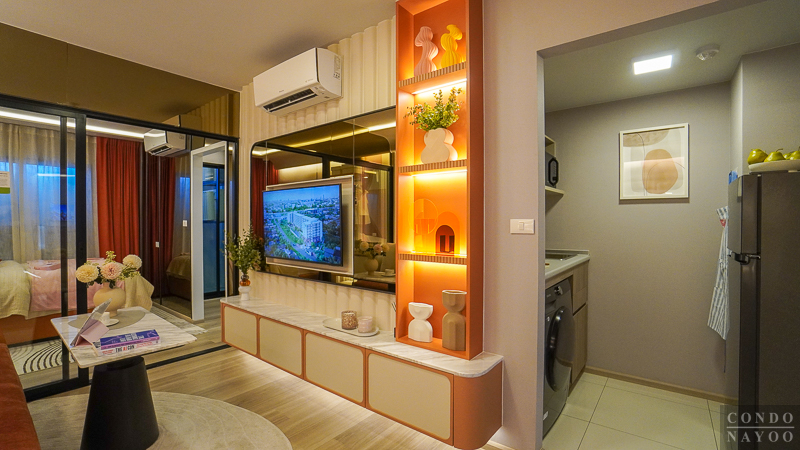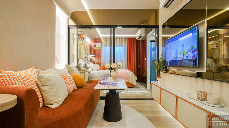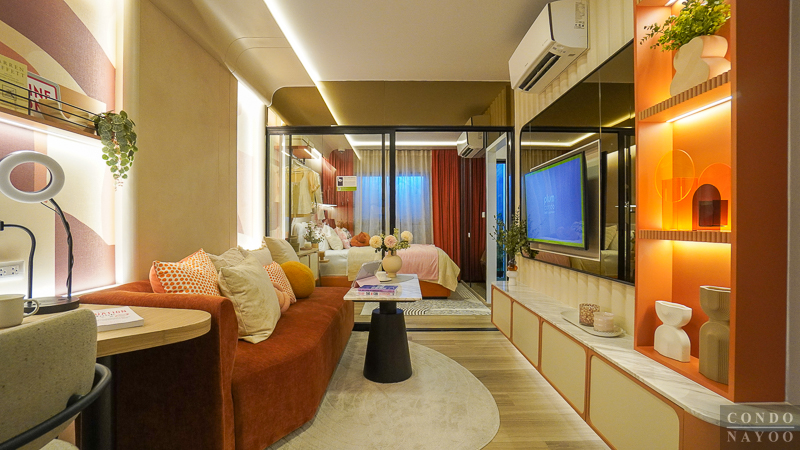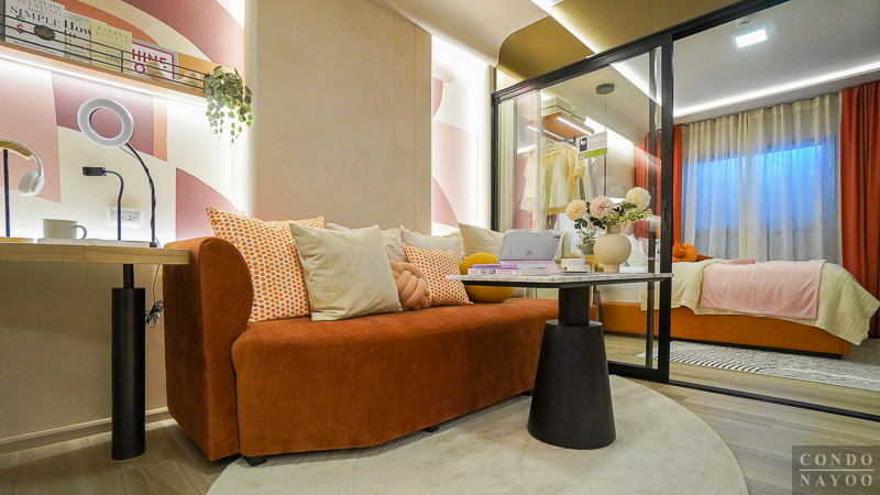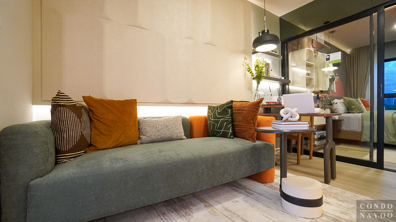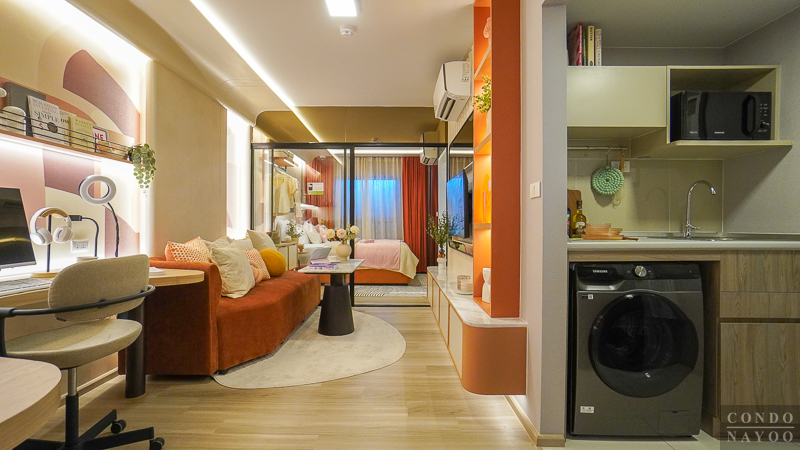ห้องพัก Type นี้ออกแบบมาได้ลงตัว แบ่งพื้นที่ใช้งานอย่างเป็นสัดส่วน เริ่มจาก ครัวเปิด ที่จัดเข้ามุมห้องไปด้านหนึ่ง ทำให้โซนนั่งเล่น-พักผ่อน-ทานอาหาร-ทำงาน มีพื้นที่กว้าง ใช้งานต่อเนื่องได้จริงโดยไม่รู้สึกอึดอัด