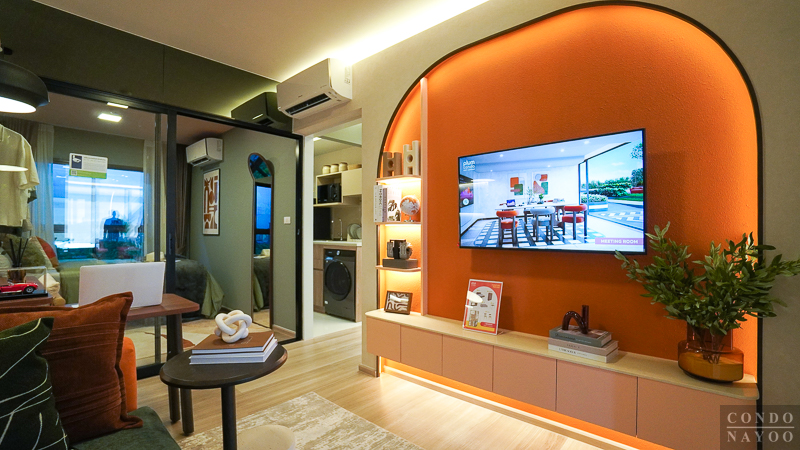 ห้องต่อมา จะเป็นห้องตัวอย่างนี้เป็นแบบ 1 Bedroom ขนาดใหญ่ ประมาณ 30.20-30.50 ตร.ม. ซึ่งถือเป็น Type หลักของโครงการอีกแบบ และยังเป็น Layout ใหม่ของ Plum Condo อีกด้วย การจัดผังห้องจะเป็นแบบตอนลึก โดยแยกโซนครัวไว้ด้านข้าง ทำให้พื้นที่โซนพักผ่อนตรงกลางกว้างขึ้น ใช้งานต่อเนื่องได้สะดวก ทั้งมุมนั่งเล่นและรับประทานอาหาร