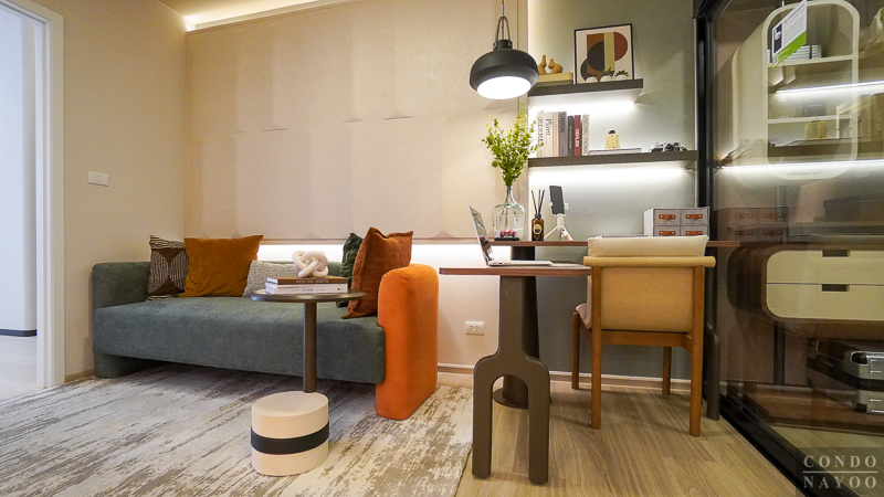 ถัดมาตรงข้างโซฟาและประตูห้องนอน จะมีพื้นที่ให้ทำเป็นมุมทำงานหรือวางชุดโต๊ะทานข้าวแบบ 2 ที่นั่งได้พอดี