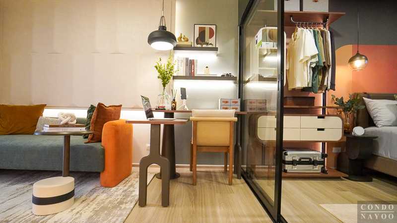 หรือถ้าใครใช้พื้นที่ด้านหน้าห้องเป็นมุมทานอาหารไปแล้ว ตรงนี้ก็สามารถปรับเป็นมุมทำงานเล็ก ๆ สำหรับ 1 ที่นั่งได้อย่างลงตัว ส่วนเสื้อผ้าที่มีอยู่ก็สามารถย้ายไปเก็บใน Walk-in Closet ได้เลย ทำให้ห้องนอนยังคงดูเป็นระเบียบ โปร่งสบาย และใช้งานได้ครบทุกฟังก์ชัน