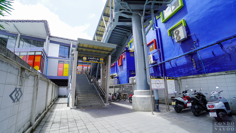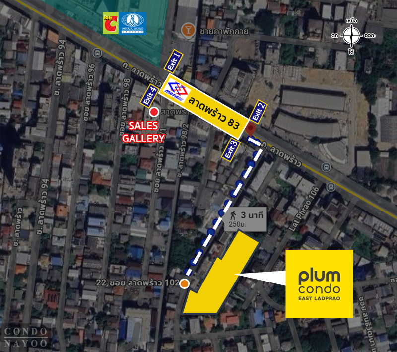 ภาพมุมสูงจากด้านหน้าคอนโด เดินออกไปใช้งาน รถไฟฟ้าสายสีเหลือง สถานีลาดพร้าว 83 ได้ใกล้ ๆ ในระยะทางเพียง 250 ม.* โดยจะใกล้กับทางออก 3 ที่อยู่ติดกับธนาคารกรุงศรีนั่นเองค่ะ