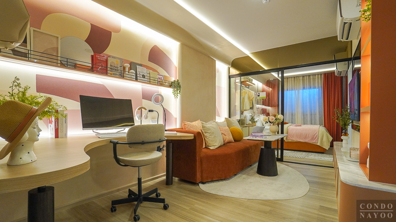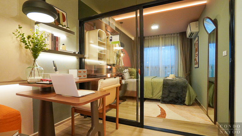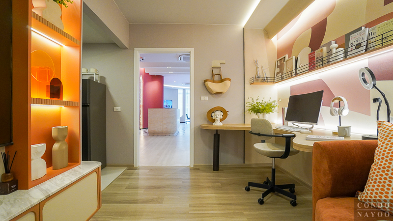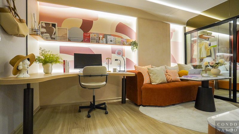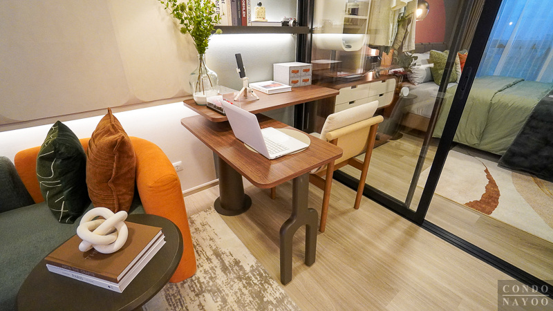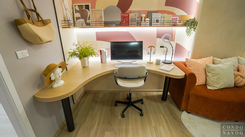 ภายในห้องตัวอย่างมีการจัดวาง โต๊ะทำงานตัว L เข้ามุมห้อง มาให้ดูเป็นไอเดียการใช้งานจริง เหมาะสำหรับคนที่ต้องทำงานที่บ้านหรือ Work From Home บ่อย ๆ