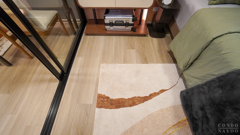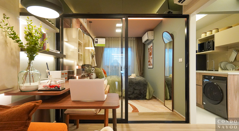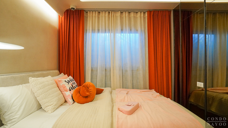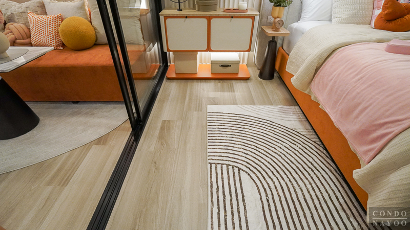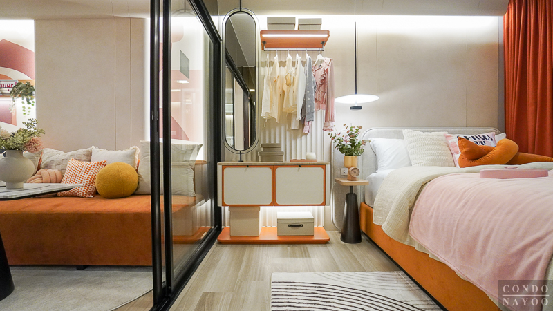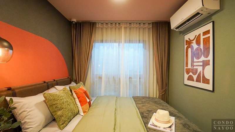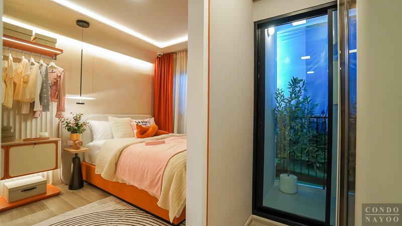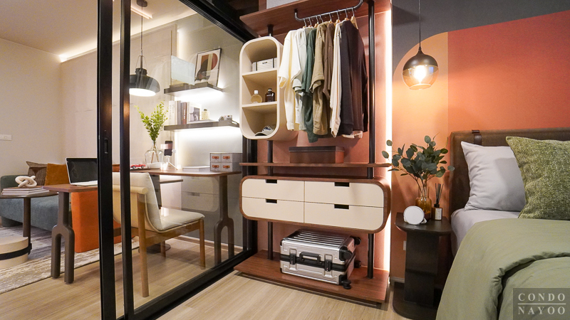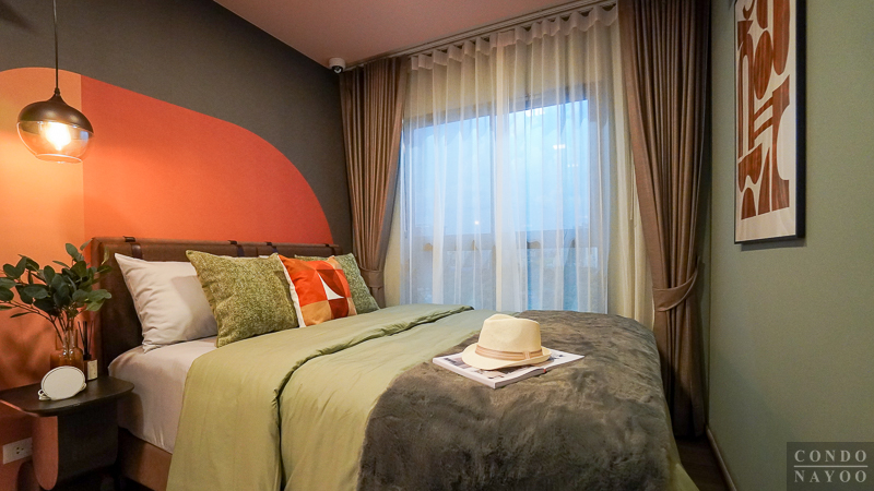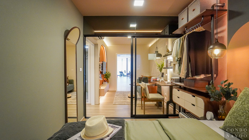 ถัดจาก Common Area เข้ามาจะเป็นพื้นที่ห้องนอน ซึ่งโครงการจัดให้มีฉากกั้นกระจกบานเลื่อนเต็มความกว้างผนัง ทำให้พื้นที่ดูกว้างและโปร่งมากขึ้น ไม่อึดอัดเวลาพักผ่อน อีกทั้งยังช่วยเชื่อมต่อบรรยากาศระหว่างห้องนอนกับพื้นที่ส่วนกลางของห้องได้อย่างกลมกลืน