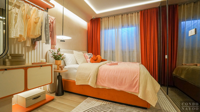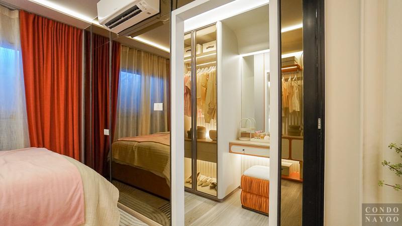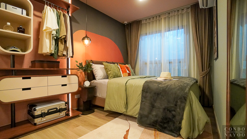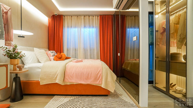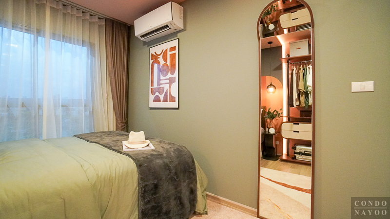 ถัดเข้าไปด้านในจะเป็น ห้องนอนขนาดใหญ่ ที่สามารถวางเตียงขนาด 5 ฟุต พร้อมตู้เสื้อผ้าได้สบาย อีกฝั่งของห้องถูกจัดไว้เป็นพื้นที่ Walk-in Closet เชื่อมต่อกับห้องน้ำโดยตรง ทำให้ใช้งานคล่องตัว อาบน้ำเสร็จก็สามารถเดินออกมาแต่งตัวได้ทันที