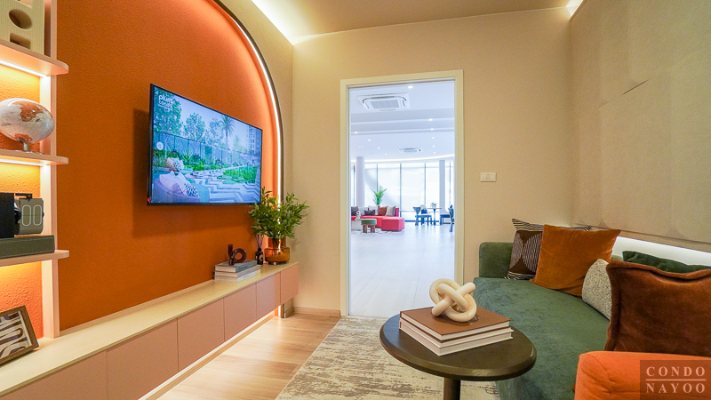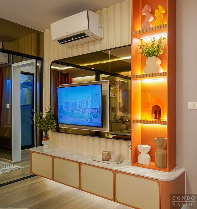 ตรงกลางติดตั้ง Smart TV จอใหญ่ก็จะยิ่งได้บรรยากาศเหมือนมุมนั่งเล่นสุดอบอุ่นของครอบครัวไปในตัว และไม่ต้องกังวลเรื่องระบบไฟฟ้า เพราะโครงการติดตั้งเตรียมไว้ครบพร้อมสำหรับการต่อใช้งานแล้ว