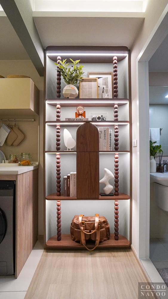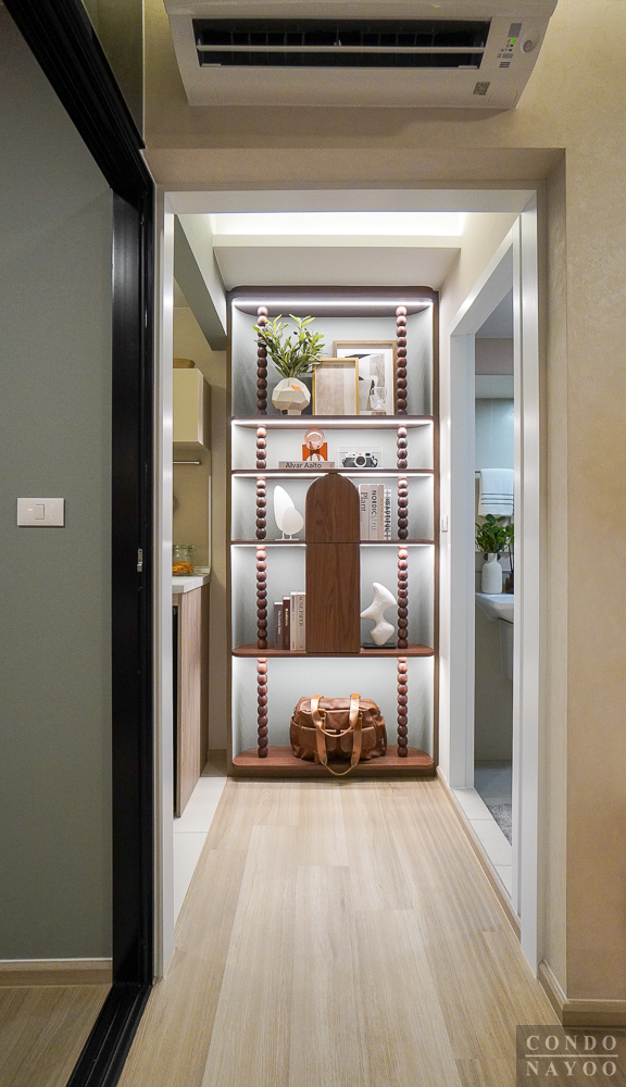 พื้นที่ตรงกลางระหว่างห้องน้ำและครัวเปิด จะมีความกว้างประมาณ 1.2 ม. สามารถเพิ่มพื้นที่เก็บของโดยวางเป็นชั้นวางของหรือตู้เก็บของแนวสูงได้ หรือจะใช้เป็นพื้นที่วางตะกร้าผ้า วางถังขยะ หรือตู้เก็บรองเท้าก็ลงตัวค่ะ