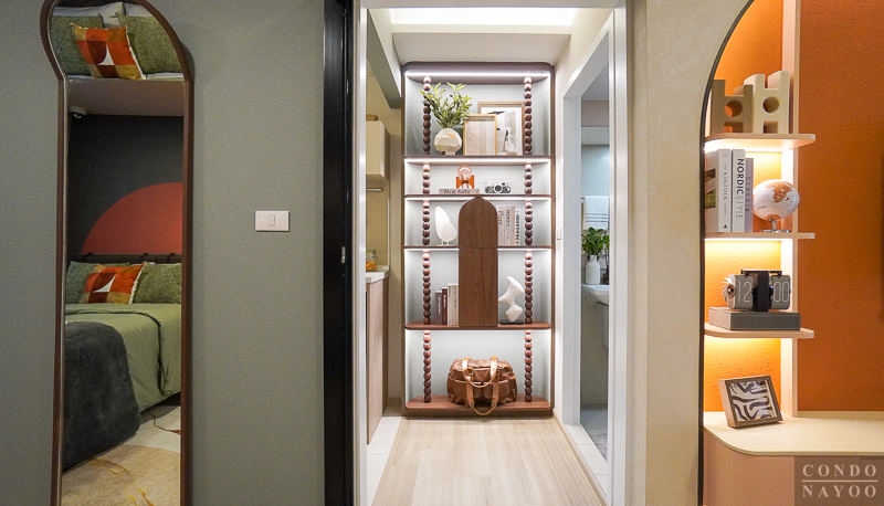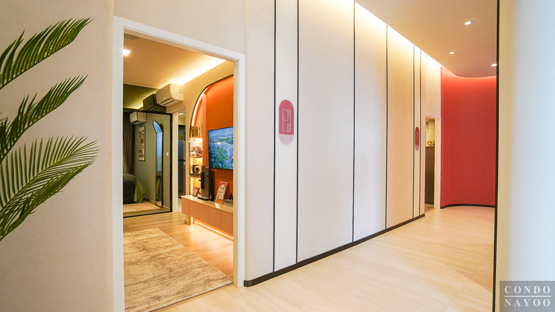 ห้องจริงในส่วนนี้จะเป็น โถงทางเดินโล่ง ๆ หากใครต้องการความเป็นส่วนตัวมากขึ้น ก็สามารถกั้นพื้นที่ด้วยบานประตู หรือเลือกใช้ผ้าม่านแทนได้เช่นกัน ปรับฟังก์ชันตามสไตล์การใช้งานของแต่ละคนได้อย่างยืดหยุ่นค่ะ