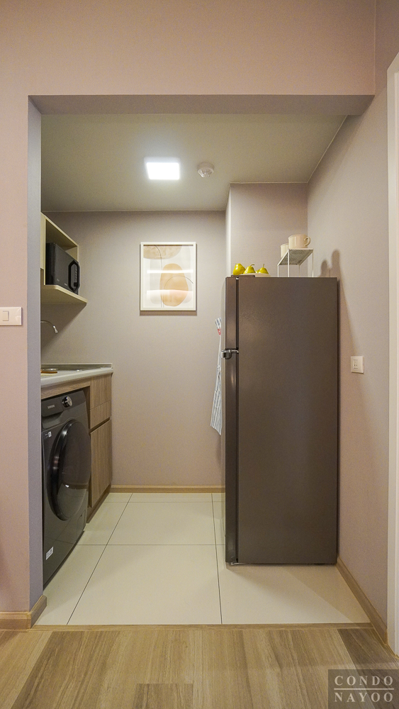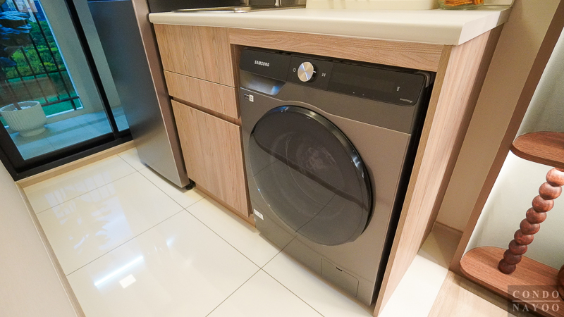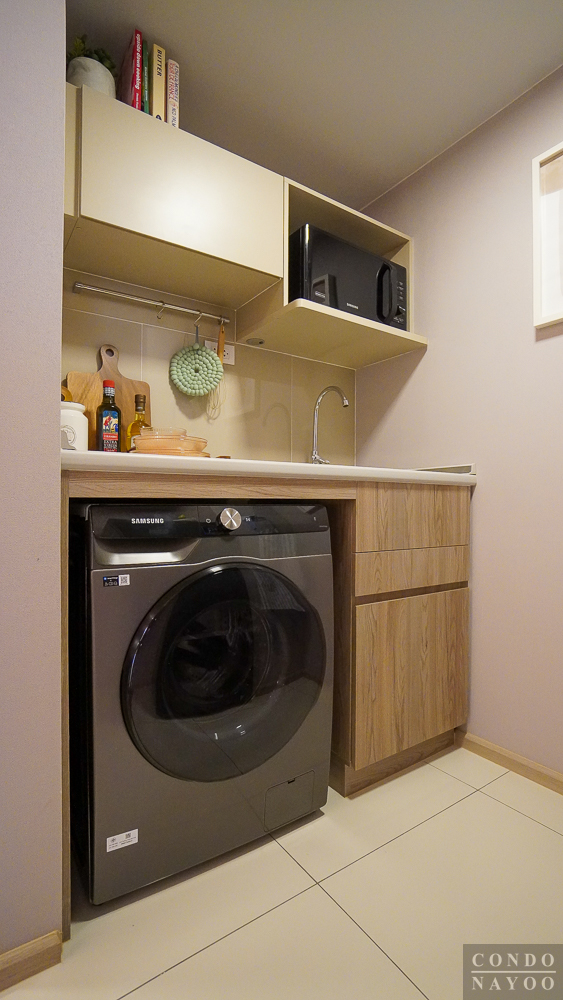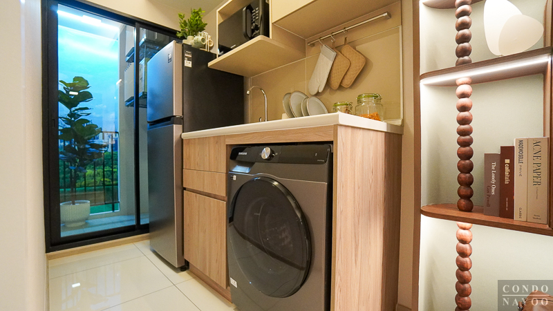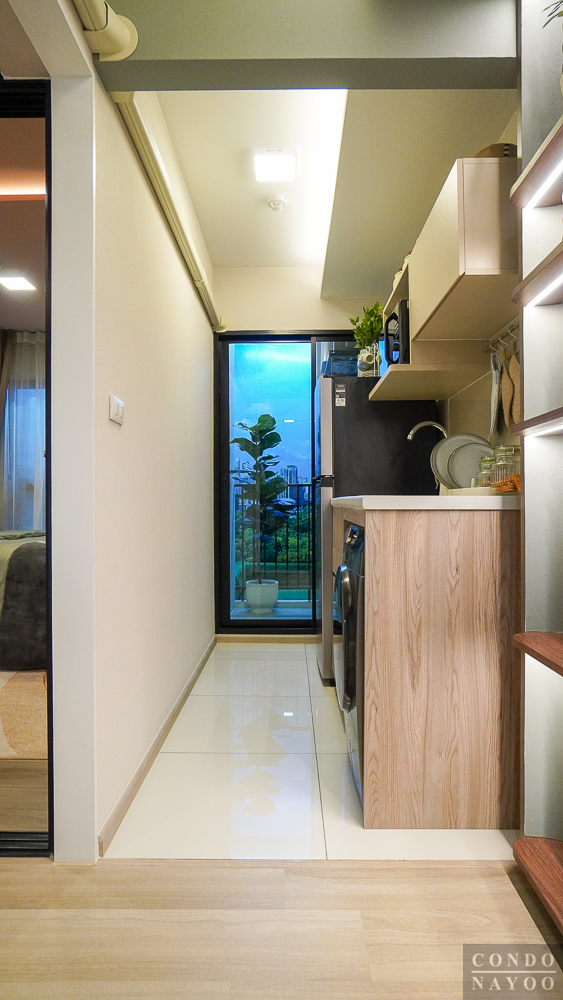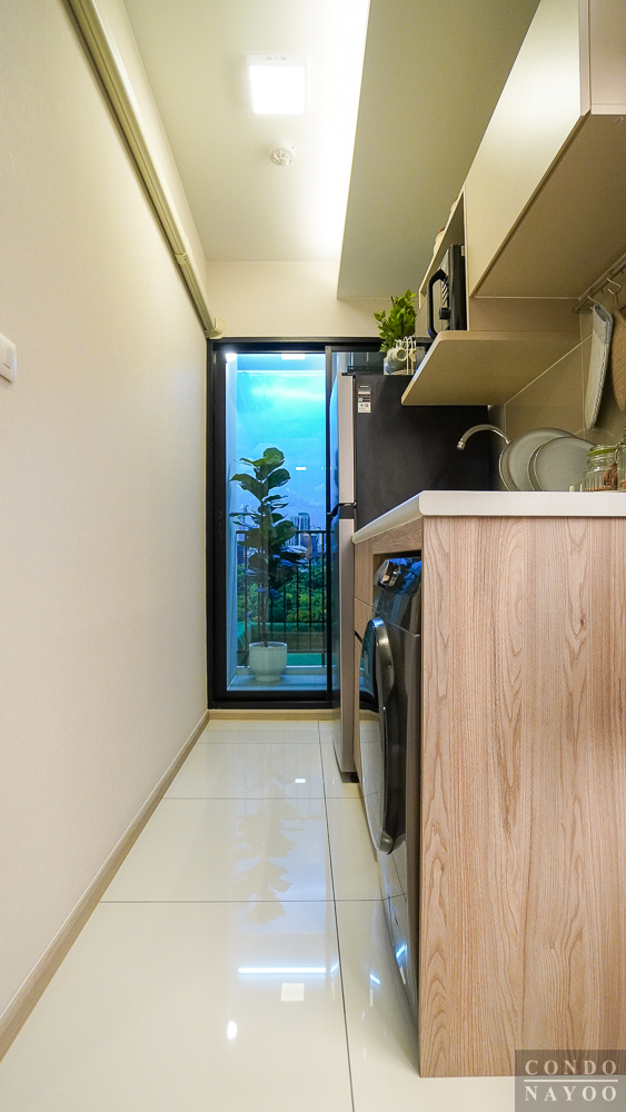 ด้านหลังสุดของห้องจะเป็น ระเบียงซักล้าง ที่ถูกแยกออกจากครัวด้วย ประตูกระจกบานเลื่อน พร้อมการยกธรณีขึ้นมาเพื่อช่วยกันความชื้นและกันฝุ่น ทำให้พื้นที่ใช้งานภายในห้องสะอาดและเป็นสัดส่วนมากขึ้น