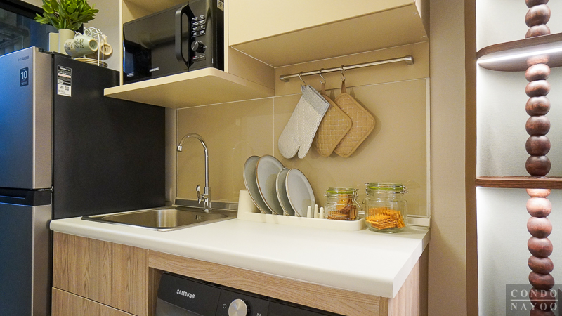 ด้านข้างมีพื้นที่เหลือสำหรับเตรียมอาหาร พักจาน วางของใช้ในห้องครัว หรือใช้เป็นพื้นที่วางเตาไฟฟ้าได้