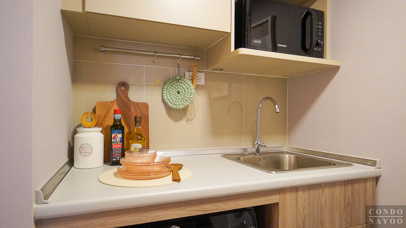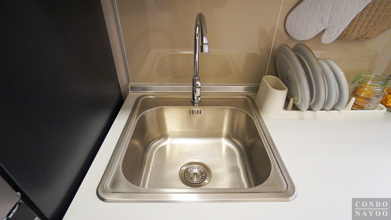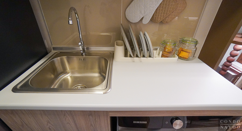 ท็อปครัวปิดผิวเมลามีนสีเทาอ่อน ได้ซิงค์สแตนเลสหลุมเดี่ยว พร้อมก๊อกน้ำ และด้านข้างจะมีพื้นที่เหลือให้เตรียมอาหาร พักจาน หรือวางเตาไฟฟ้าได้