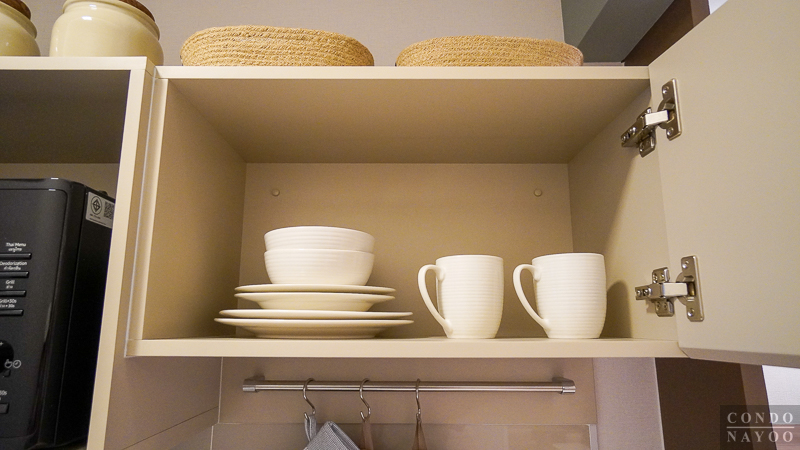 ตู้เก็บของเป็นแบบบานเปิด Soft Close ด้านในสามารถเก็บจานชาม ถ้วยกาแฟ แก้วน้ำ หรือใช้เป็นตู้ Stock ของแห้งได้