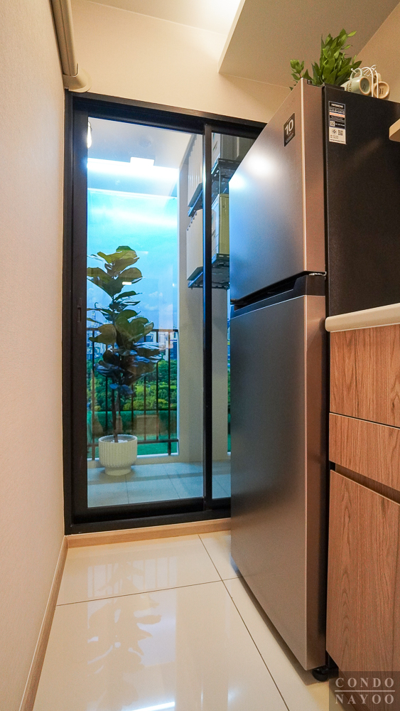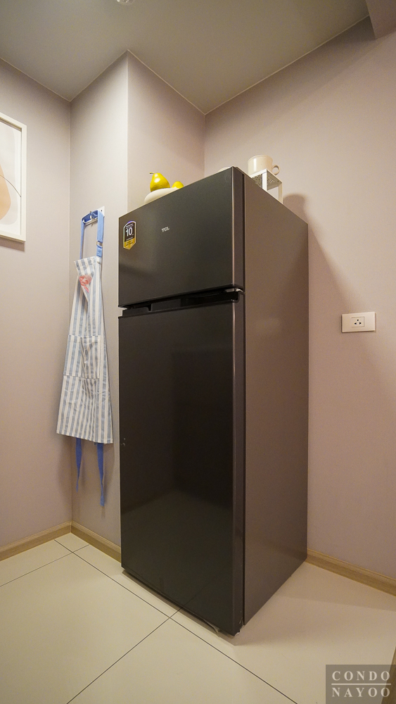 ขวามือเป็นพื้นที่สำหรับวางตู้เย็น รองรับขนาด 6-10 คิวได้ และข้างตู้เย็นจะมีพื้นที่เหลือให้วางถังขยะ หรือชั้นวางของแนวสูงเพื่อเพิ่มพื้นที่เก็บของได้อีกด้วย