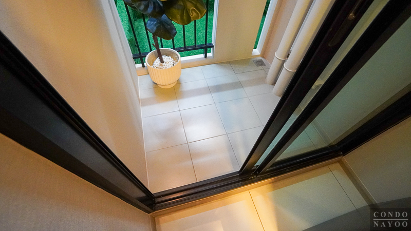 ด้านหลังสุดของห้องจะเป็น ระเบียงซักล้าง กั้นด้วยประตูกระจกบานเลื่อน ซึ่งไม่เพียงใช้แยกฟังก์ชัน แต่ยังช่วยนำแสงธรรมชาติผ่านเข้ามายังโซนแต่งตัว ให้บรรยากาศดูโปร่งและสว่างขึ้นอีกด้วย