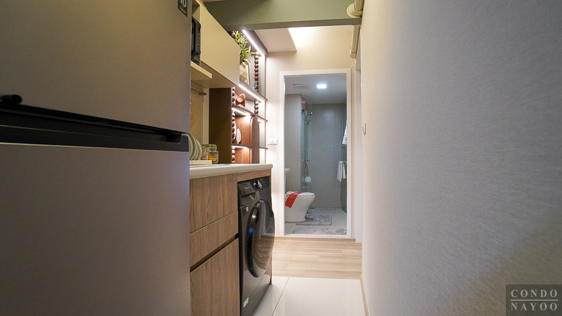 อีกฝั่งของห้องจะเป็น โซน Service แยกพื้นที่พักผ่อนออกจากพื้นที่ใช้งานหนักอย่างชัดเจน ด้านขวามือเป็นห้องน้ำ ใช้งานสะดวก ส่วนซ้ายมือเป็นครัวเปิด เชื่อมต่อกับระเบียงซักล้าง ช่วยระบายกลิ่นควันและเพิ่มความเป็นระเบียบให้กับห้องค่ะ