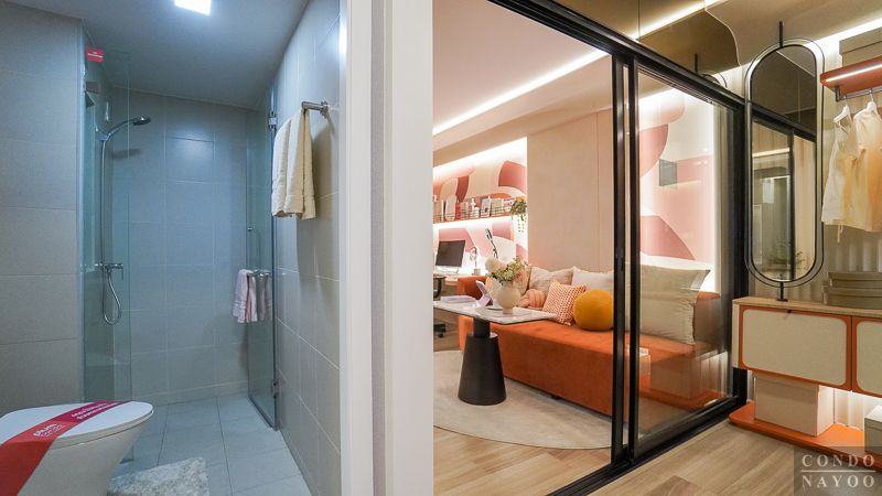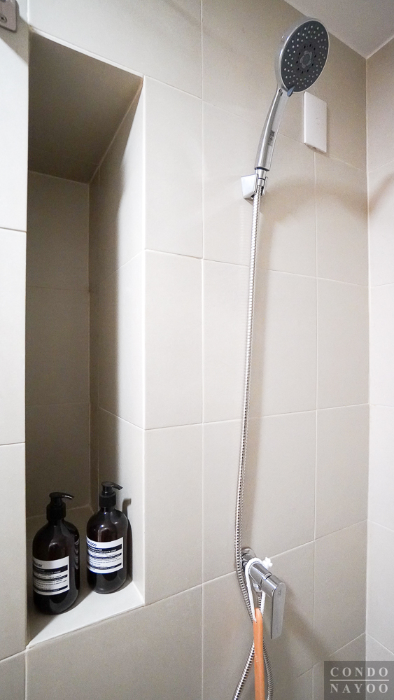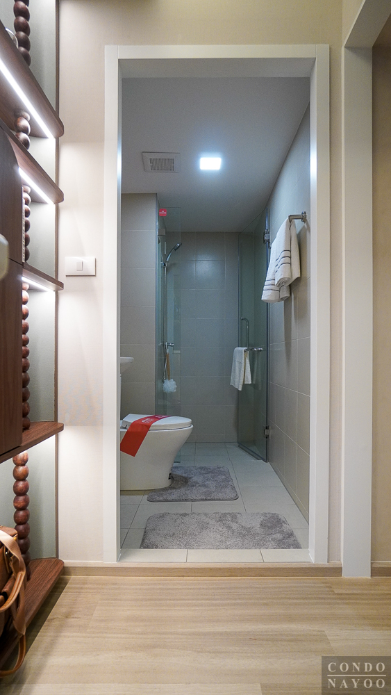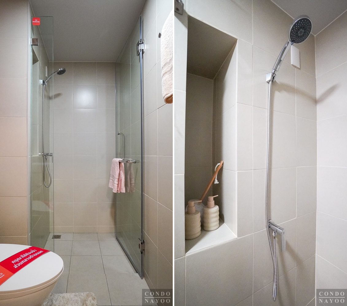 ด้านในสุดเป็นส่วนอาบน้ำ ได้พื้นที่ใช้งานขนาดกว้างกำลังพอดี ด้านในจะติดฝักบัว Hand Shower ก๊อกน้ำก้านโยก ผนังเจาะช่องทำชั้นวางของ และมี Junction Box ไว้สำหรับติดเครื่องทำน้ำอุ่นได้เลย