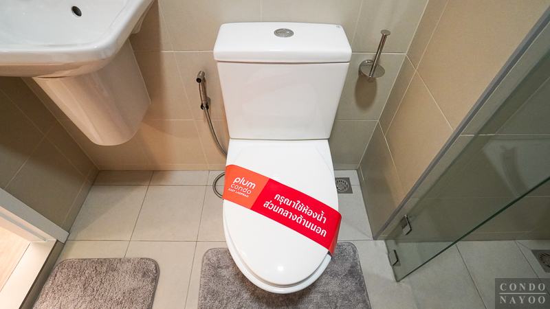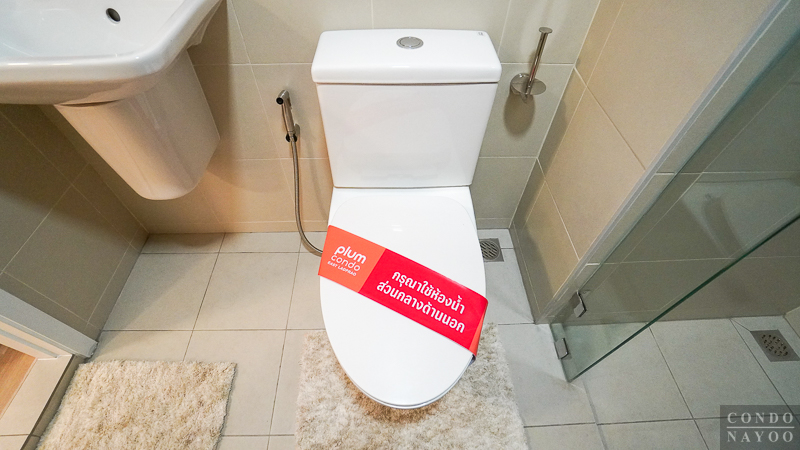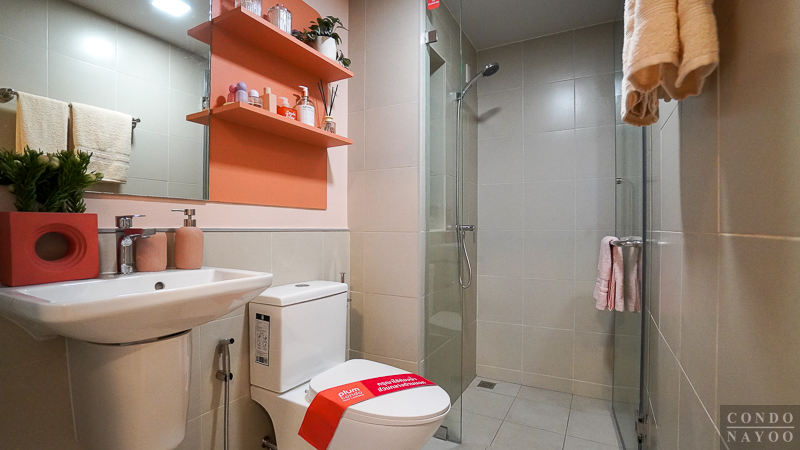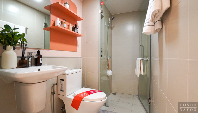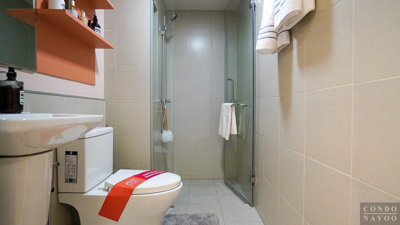 ห้องน้ำเป็นแบบตอนลึก แบ่งส่วนแห้ง แยกส่วนเปียกให้ชัดเจน ตกแต่งกระเบื้องพื้นและผนังคุมโทนสีเทา ติดสุขภัณฑ์มาตรฐานของ Cotto มาให้พร้อมใช้ และในห้องน้ำจะมีพัดลมระบายอากาศแบบฝังฝ้าติดมาให้ด้วย 1 เครื่อง