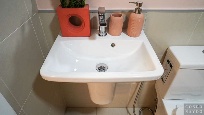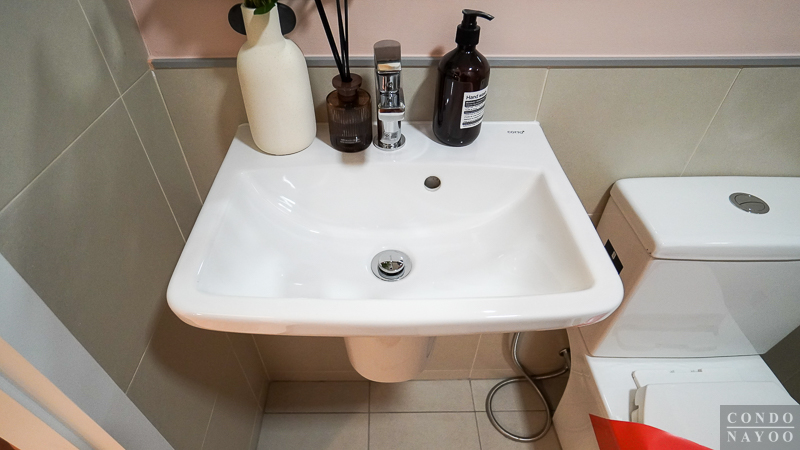 ได้อ่างล้างทรงเหลี่ยมแบบแขวนผนัง ก๊อกน้ำก้านโยก หน้าอ่างมีพื้นที่ให้วางขวดสบู่ ถ้วยใส่ยาสีฟัน แปรงสีฟัน และอื่น ๆ ได้พอสมควร และใต้อ่างจะมีพื้นที่ไว้สำหรับวางถังขยะหรือชั้นวางของเล็ก ๆ ได้