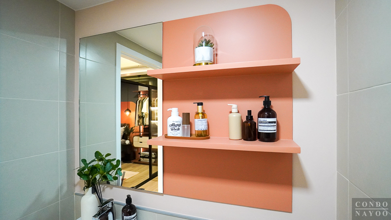 ผนังด้านหลังโซนแห้งจะเป็นผนังฉาบเรียบทาสีชมพูอ่อน ตัดกับโทนกระเบื้องสีเทาได้อย่างลงตัว ดูเรียบง่ายแต่มีลูกเล่นเพิ่มความอบอุ่นให้กับบรรยากาศ ห้องจริงทางโครงการจะติดตั้งกระจกเงาด้านหลังอ่างล้างหน้าให้ 1 บาน ส่วนที่เห็นเป็นชั้นวางของด้านข้าง เป็นเพียงการตกแต่งเพื่อเป็นไอเดียการใช้งาน ไม่ได้มีให้ในห้องจริงค่ะ