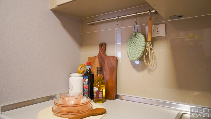 ผนังครัวทำ Backsplash มาให้เรียบร้อย และมีราวแขวนผ้า รวมถึงปลั๊กไฟติดมาให้ครบ