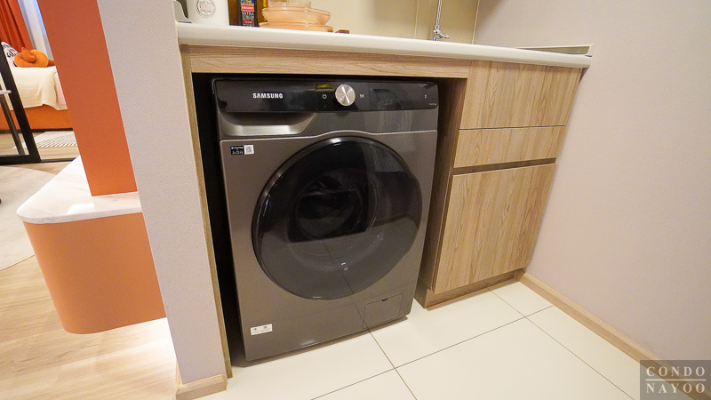 ด้านล่างมีช่องสำหรับวางเครื่องซักผ้าฝาหน้า ที่ด้านหลังจะมีการเดินงานระบบน้ำ ระบบไฟมาให้พร้อมต่อใช้งานได้เลย