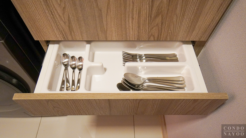 ติดกันมีลิ้นชักพร้อมถาดใส่ช้อนส้อมให้ 1 ชั้น ช่วยจัดเก็บอุปกรณ์เล็ก ๆ อย่างช้อน ส้อม มีดได้เป็นระเบียบ ไม่รกเคาน์เตอร์