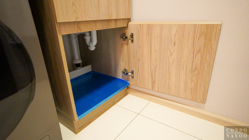 ด้านล่างจะมีช่องสำหรับวางเครื่องซักผ้าฝาหน้าให้ โดยที่ด้านหลังจะมีการเดินงานระบบน้ำ ติดท่อน้ำดี ท่อน้ำทิ้ง และมีปลั๊กไฟติดมาให้ครบพร้อมต่อใช้งาน