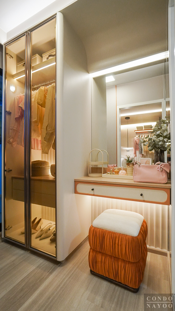 Walk-in Closet แอบอยู่ด้านหลัง เป็นการจัดแยกโซนออกมาได้เป็นสัดส่วน มีพื้นที่แนวยาวให้วางตู้เสื้อผ้าและวางโต๊ะเครื่องแป้งแบบ 1 ที่นั่งได้